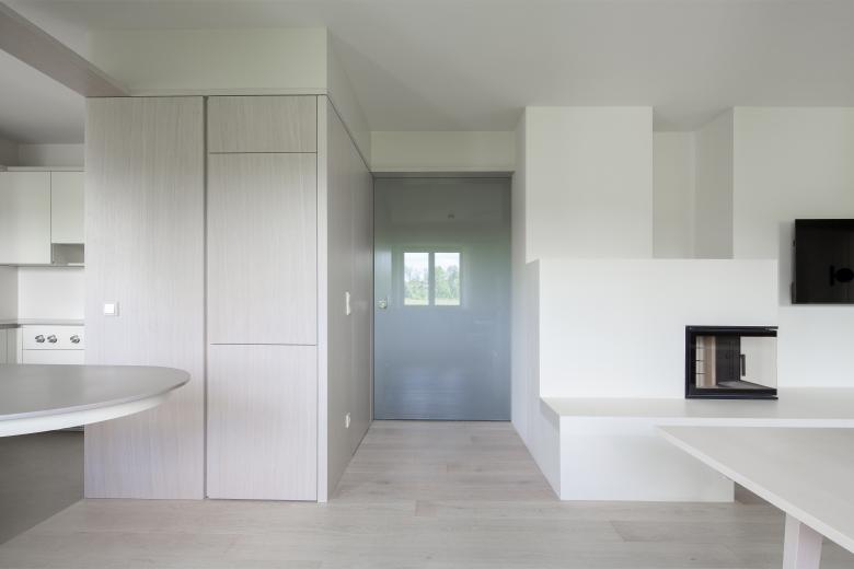 Die verwendeten Materialien von gebeizter Eiche, hell geöltem Ahorn und leicht cremefarbener Wandmalerei, werden von den Bauherrn selbst oder mit farbigen Accessoires zum Leben erweckt. Sie bilden lediglich die sehr neutrale Kulisse für das eigentliche Leben.