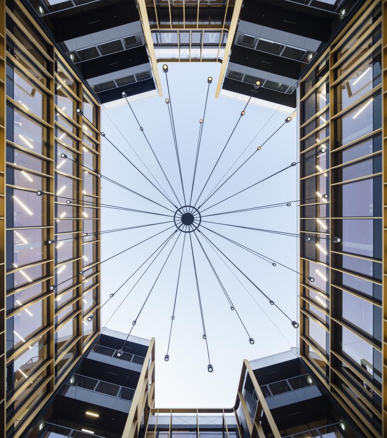 Diese besondere Erschließung trägt dem Berliner Hinterhof Rechnung und führt die langjährige Tradition des historischen Gewerbeareals fort. Die für Berlin typischen zusammenhängenden Hofkomplexe entwickelten sich im Zuge der städtischen Verdichtung zum Ort des alltäglichen Austausches des 19. Jahrhunderts. Dieser Hinterhofcharme soll auf den Neubau übertragen werden. Mit seiner Aufgabe als übergeordnete Lobby erhält der Innenhof durch seine Terrassendecks, die als Sitzmöbel oder Pflanzbecken dienen. zusätzliche Aufenthaltsqualität. Eine besondere Atmosphäre verleiht ihm der von Lichtplaner*innen jack be nimble angefertigte Kronleuchter. Mit 40 Leuchtköpfen ausgestattet und einem Gesamtdurchmesser von acht Metern, überspannt er den gesamten Innenhof.