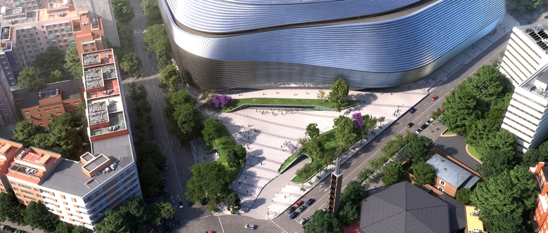 While visually dominating its surroundings, the stadium volume is adapted to the program behind it, swelling or shrinking without losing unity or character.