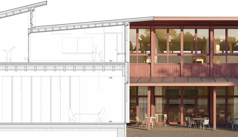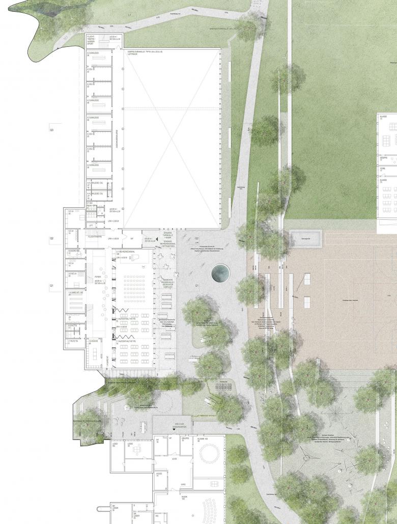 Aufgeteilt wird das Raumprogramm aus Sporthalle, Tagesbetreuung und Musikschule auf zwei Gebäudetrakte. Mit der zueinander versetzten Anordnung der beiden Trakte und dem bestehenden Schulhaus im Süden wird ein kleiner Vorplatz aufgespannt. Als Terrasse öffnet er sich nach Osten auf den tiefer gelegenen «roten Patz» und zeichnet den Haupteingang aus.