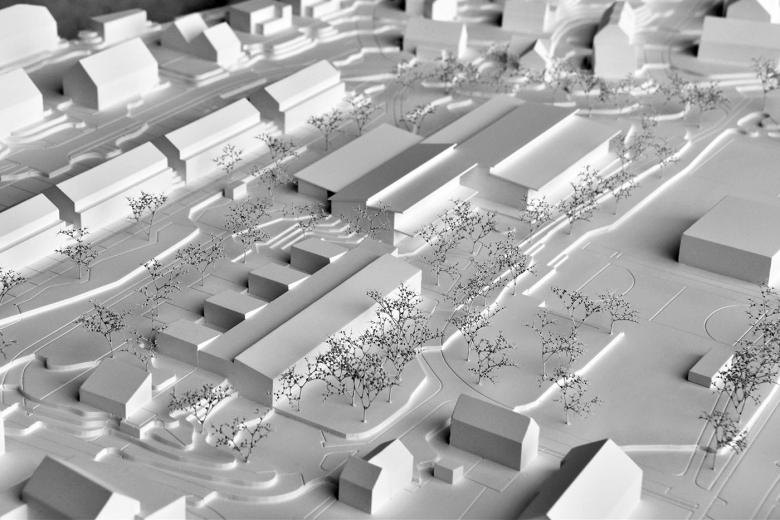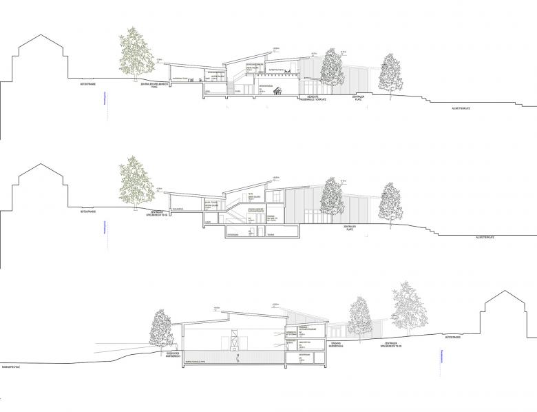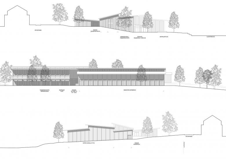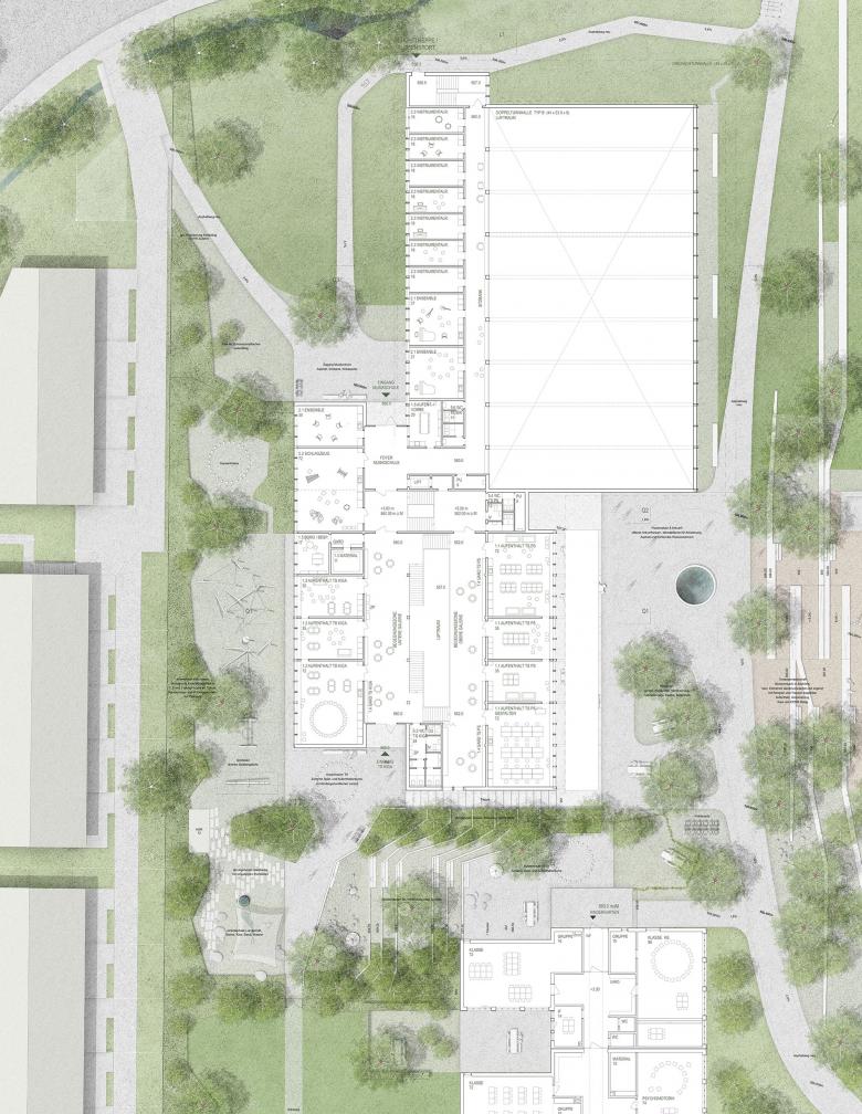 Die vorgeschlagene Erweiterung hält die Ebene der Sportfelder frei und besetzt die nordwestliche Geländekante des Schulareals. In die Verlängerung der bestehenden Gebäudeflucht gesetzt, erweitert der Neubau den Bestand nach Norden. Dabei nimmt auch er die ansteigende Topographie so auf, dass zum Schulareal hin zweigeschossige Fassaden blicken und zur Nachbarschaft im Westen hin nur eingeschossige Flügel in die Ebene ausgreifen. Eine Landschaft parallel ausgerichteter Pultdächer und Sheds überspannt das linear gegliederte Volumen in seiner Längsrichtung, öffnet das Haus nach Osten und Westen und belichtet die innenliegenden und z.T. tiefen Räume.