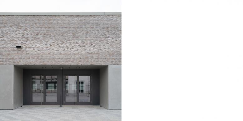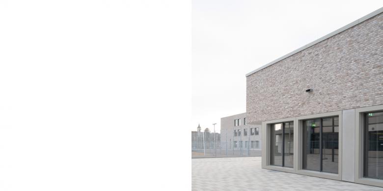 Die Sporthalle bildet mit der Oscar-Paret-Schule den Schulcampus im Zentrum Freibergs. Die Zugehörigkeit der beiden Gebäude zueinander wird durch die gleiche Fassadengestaltung und Materialität hervorgehoben.
