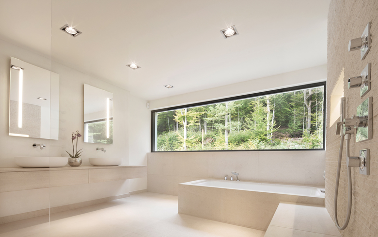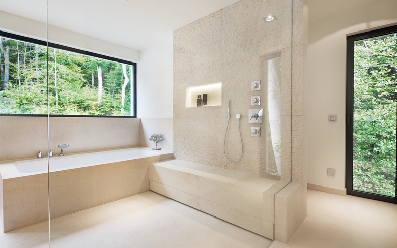Im Bad treffen matt geschliffene, großformatige Natursteintafeln auf scharrierte Oberflächen gleicher Herkunft.