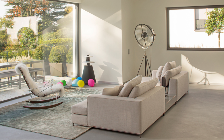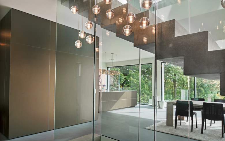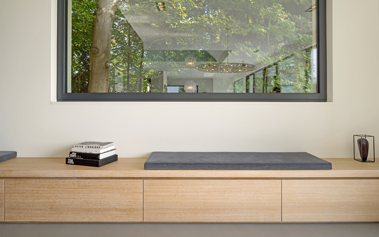 Das Haus ist am Waldrand gelegen. Bodentiefe Schiebefenster öffnen den Wohnraum zum weitläufigen Garten. Gegenüber der üppigen Gartenvegetation mit ihren vielfältigen Farbtönen nehmen sich die Farben im Innenraum bescheiden zurück. Die gewählten Materialen begegnen sich als Gegensatzpaare:
