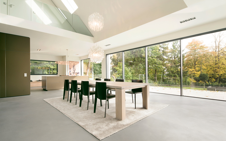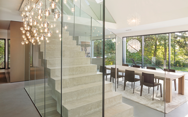 Cleane, weiße Wände treffen auf eine zementgraue Boden-Beschichtung, die an unbehandelten Estrich erinnert. Eine frei im Raum verlaufende Treppe aus gegossenem Sichtbeton wird flankiert von maschinell hergestellten, transparenten Glasscheiben.