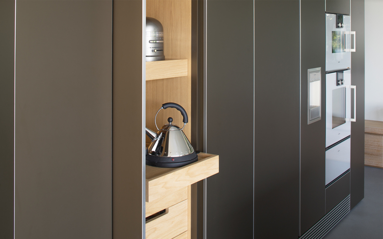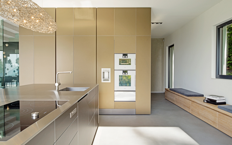 Kontrast auch im Möbelbau. Hier trifft makelloser Hightech-Look auf natürlich gewachsenes Massivholz. In einem raumhohem Möbelkubus aus bronzefarben eloxiertem Aluminium sind neben der Garderobe und einem Lagerraum auch Funktionen der Küche untergebracht. Aus dem gleichen Material sind die grifflosen Fronten der Kochinsel gefertigt. Dem gegenüber behauptet sich der Esstisch und ein Lowboard in der Küche aus gekalktem Eichenholz.