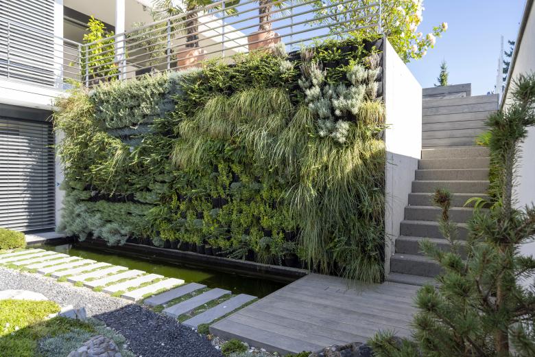 Bei der Neugestaltung seines privaten Aussenraumes entschied sich der Bauherr, eine bestehende Wand in das Gartenkonzept einzubeziehen und effektvoll zu begrünen. Es wurde also eine gut 16 Quadratmeter grosse Aluminium-Konstruktion entwickelt – exakt auf die Masse der dahinterliegenden Betonfläche abgestimmt. Darin integrierte man spezielle Fassadenbegrünungsmodule mit 36 Pflanzentaschen pro m2, welche mit mineralischem Substrat befüllt sind. In Zusammenarbeit mit der Gartenbaufirma Ingold, welche die restlichen Gartenarbeiten ausführte, wurden schliesslich die Pflanzen für die Greenwall ausgewählt. Das Ziel war es, eine vertikale Gräserlandschaft zu kreieren, die optimal mit dem Begrünungskonzept des Gartens korrespondiert. Ergänzt wurden die Gräser durch verschiedene trockenheitsverträgliche Stauden in Grün- und Silbertönen – beispielsweise die Heckenmyrte, die Kriechspindel oder das Silberblatt. Insgesamt wurde die Wand mit weit über 500 Pflanzen bestückt.
