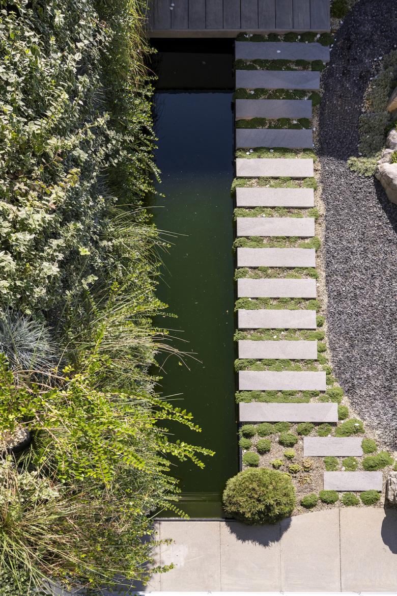 Für die Bewässerung der Pflanzen sollte das Wasser aus dem bestehenden Teichbecken direkt vor der Wand genutzt werden. Im engen Austausch mit der Firma Ingold generierte man über ein Pumpensystem mittels Bewässerungssteuerung einen Kreislauf. Zudem integrierte Hydroplant zwei LED-Scheinwerfer in die Greenwall. So kommt der einzigartige vertikale Garten nun zu jeder Tages- und Nachtzeit hervorragend zur Geltung.