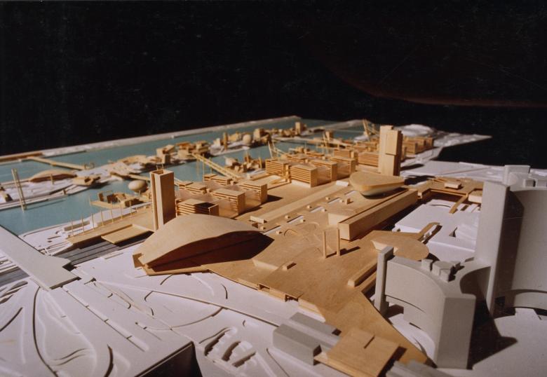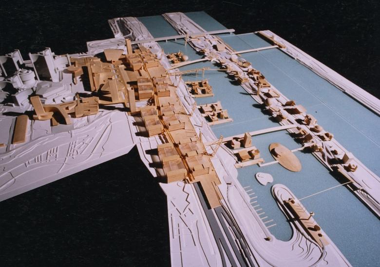 Die Blöcke finden eine Fortsetzung in schwimmenden Piers, die ein Übergreifen und Zusammenschließen mit der anderen Uferseite andeuten.
