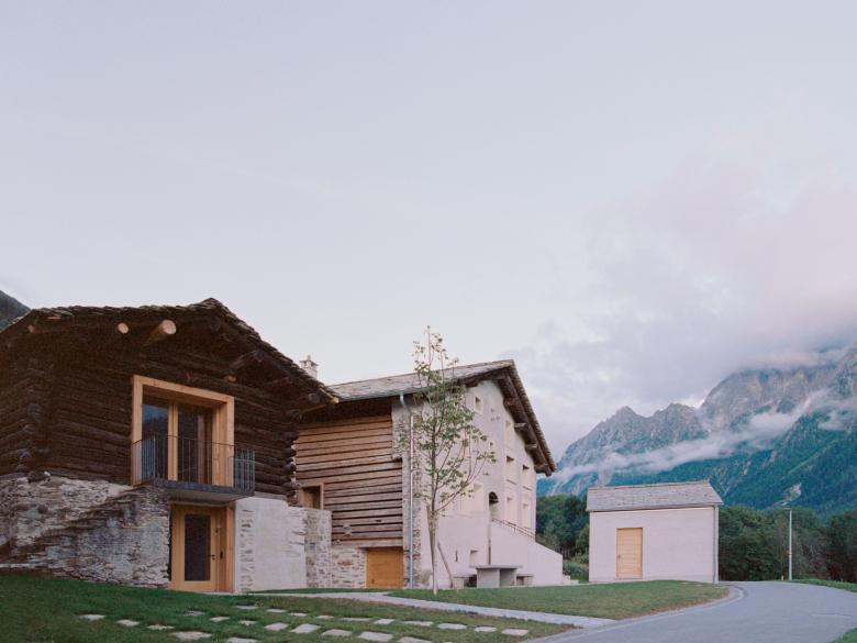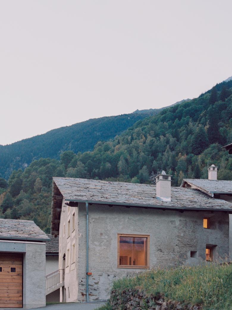 Das Gebäudevolumen, bestehend aus zwei Gebäudeteile, prägt mit seiner starken Präsenz die Dorfsilhouette bzw. den historischen Dorfrand sehr stark. Das Wohnhaus aus dem Jahr 1719 befand sich in einem sehr schlechten Zustand. Somit war nicht der maximale Erhalt historischer Substanz das Ziel, sondern was nutzbar war wurde weitergenutzt und durch neue Elemente ergänzt. Alt und Neu wurden nicht als Bruch oder als Kontrast zueinander inszeniert, sondern als ein miteinander verbunden. Eine Haltung, die seit Jahrhunderten das Bauen im Bergell bestimmt hat. Es entstand eine Kombination von Materialien: Zum Kalkverputztem Bruchsteinmauerwerk tritt Sichtbeton für die neuen konstruktiven Elemente auf, die alten Holzverkleidungen wurden als Bodendielen oder wieder als Wandverkleidungen wiederverwendet und die alten Dachbalken teilweise für die Herstellung der Fenster, und Türrahmen weiterverarbeitet. Alle Materialien treten zueinander auf, ohne ihre Eigenständigkeit zu verlieren. Die Neu eingebaute Bauteile weisen einen zeitlosen Charakter auf und ergänzen sich ideal mit der historischen Bausubstanz. Um die Seele des Wohnhauses nicht zu zerstören, wurden die Jahrhundert alten Fassaden nur geflickt und der Charakter des Dorfeingangs bewahrt.