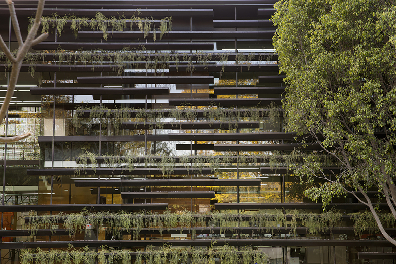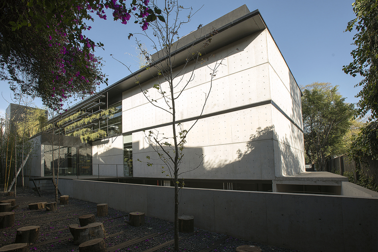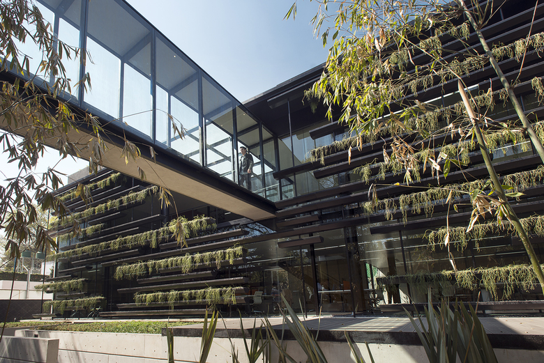 The new building was positioned directly behind the yellow glass box of Falcón I on the footprint of an existing structure that was demolished to allow room for a new underground parking and two story structure. A main challenge to over- come was the proximity to the existing building. Rojkind Arquitectos invited Gabriela Etchegaray to work together in the design of this project. The team decided on a simple transparent rectangular box to contain the expansion with plenty of natural light and undisturbed garden views. A simple transparent glass curtain wall was fronted with a sun control layer composed of 510 modular planters arranged in an offset linear configuration that continue the garden feel over the façade. The drip-irrigated planters also help cool the building in a passive solar way. The garden was then strategically taken to the inside of the glass rectangle through double height atriums that give the interior a lofty feel. Vertical circulations were grouped at the back to preserve the sense of transparency.