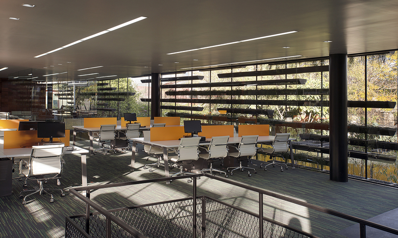 A bridge connects the rooftop park of the expansion with a new employee dining hall placed over the existing Falcón I building. Extensive landscape of the surrounding grounds and a new street entry structure complete the overall design.