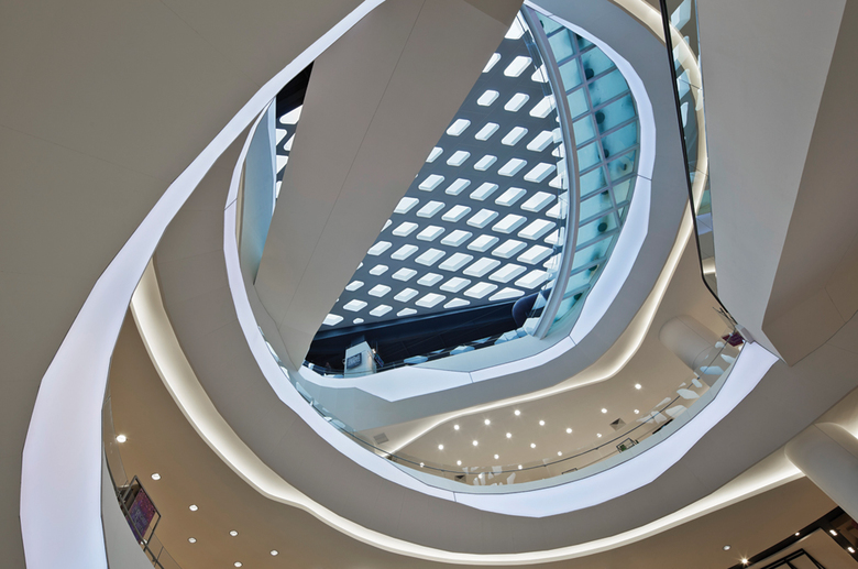 The curved backlit balconies are intended to be a reminder of the fluidity of the exterior façade but at a more human scale as opposed to the urban scale of the exterior façade.