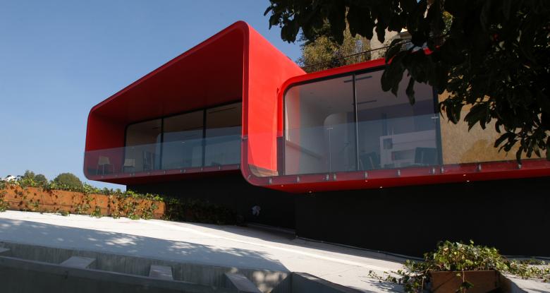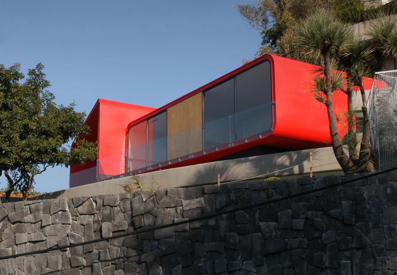 Located in Tecamachalco, State of México, on a hillside overlooking Bosques de Reforma, an existing late 60’s house required a renovation and an extension. Since the client bought the house for its distribution, the existing house was carefully cleaned out, leaving bigger and better areas, then a new part of the program was required, an independent apartment for the client’s daughter. Inside the garage there are 2 separate entrances, providing total independence to the extension, which is accessed through a spiral staircase going 2 flights up. Resembling a ballet, displaying 2 bodies in motion, the looping sensual forms of changing angles coming out of every curve, where inspired by the ballet dancer who is going to inhabit it. The apartment consists of 2 half levels, the first contains the kitchen, dining and living area, then a half flight down; the t.v. room and the master bedroom. Taking advantage of the roof of the existing house and its skylights, this roof becomes a terrace built with the remaining of the chipped lava rocks used for the main wall of the house, the skylights become acrylic stools, benches and chaise lounges that change color with an LED system. A selection of pre-hispanic organ plants adds a touch of vegetation giving this area a lunar feel.