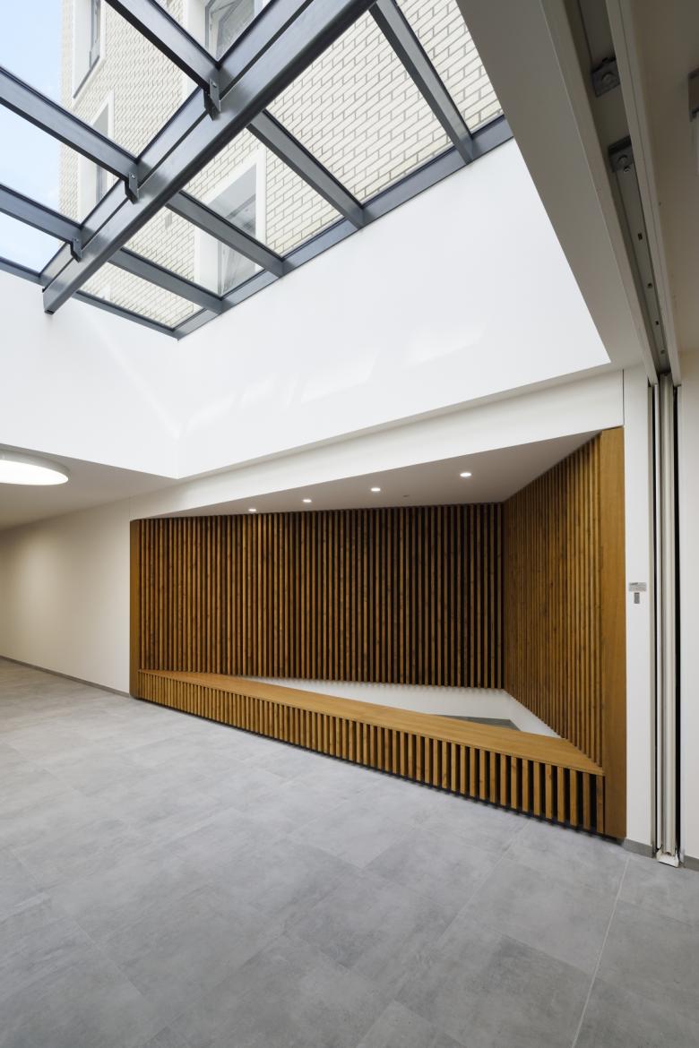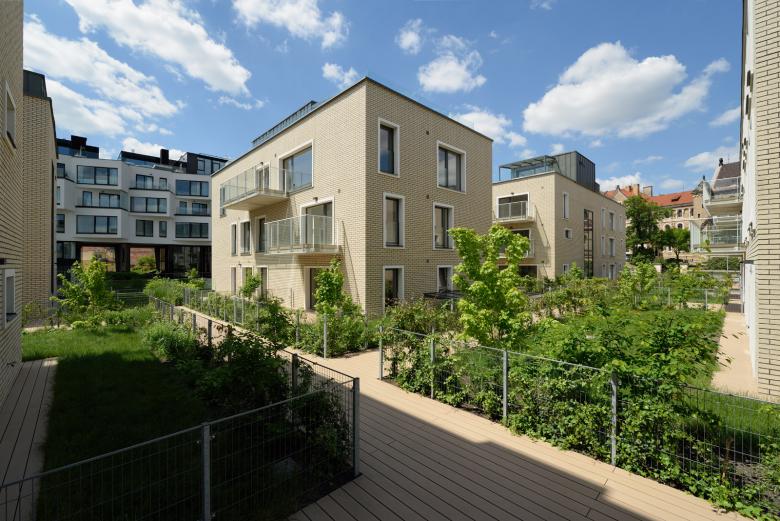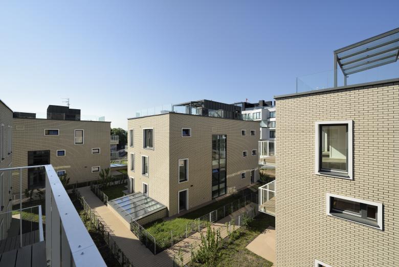 The ground floor consists of a single-storey glazed plinth, which is dedicated to services and commercial and administrative functions. Five irregular prisms with apartments of various sizes emerge from the ground floor. Their smaller scale and brick cladding, create a gradual transition from solid blocks on the west side to the existing Sacre Coeur park on the east. The roof gardens on the 2nd floor level forms green courtyard spaces between apartments. The recessed 4th floor offers terraces and gardens. Parking spaces, storages and technical equipment are located in the basement.