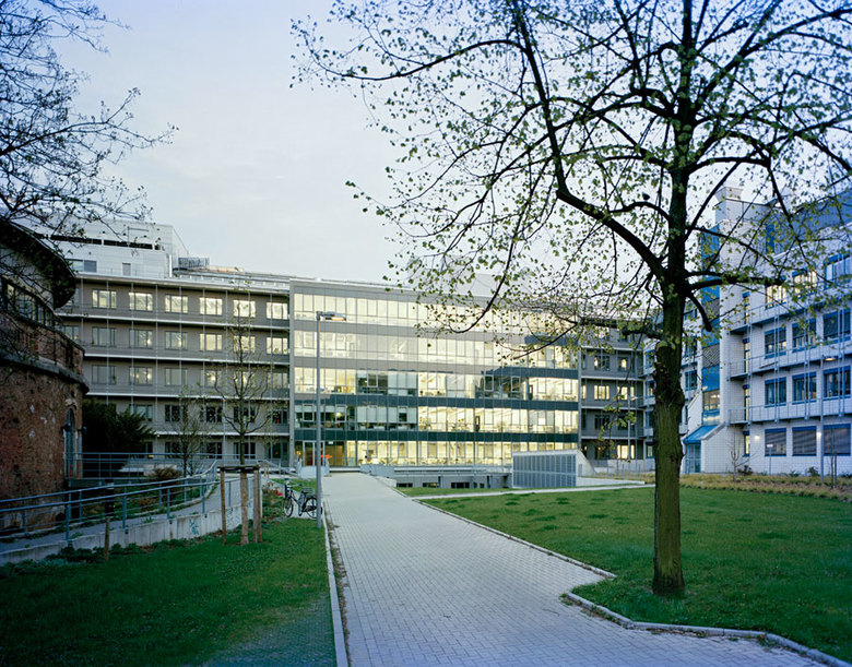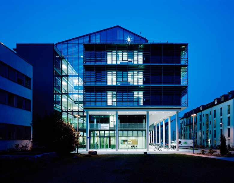 Im biowissenschaftlichen Zentrum sind die Institute für Botanik, Zoologie und Entwicklungsbiologie angesiedelt. Der kompakte Baukörper fügt sich in die vorhandene orthogonale städtebauliche Struktur.