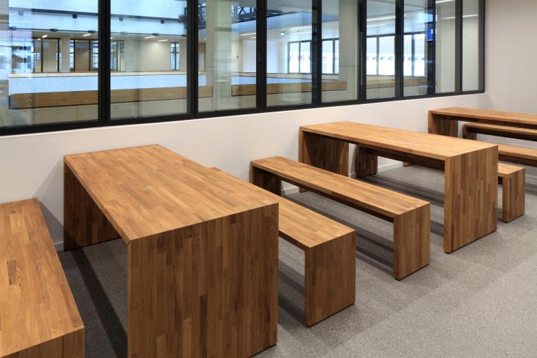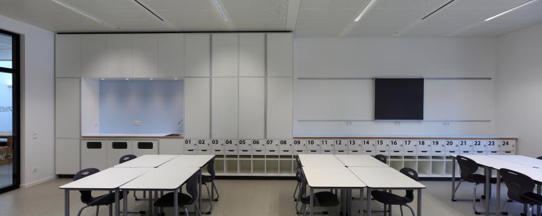 Der sich dazwischen aufspannende grosszügige, offene Raum ist im Norden das Foyer, im Süden die Cafeteria und dazwischen die "gemeinsame Mitte", der Hauptversammlungsort, das "Herz" der Schule mit seinen Sitztreppen, der Bühne im UG, der "Leselounge" im OG und der vertikalen Offenheit, die alle drei Geschosse miteinander verbindet.