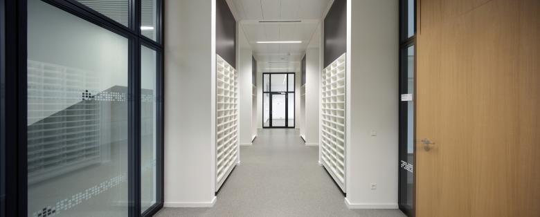 Der bestehende eingeschossige Verbindungsbau wird umgebaut und später zur Anbindung der nächsten Baustufe, welche die SEK II aufnimmt, nach Osten verlängert. Diese "Schulmagistrale" verbindet zukünftig die drei Schulstufen in Ost-West-Richtung und erschließt mit einer Reihe von Ausgängen die Außenbereiche im Süden und verknüpft damit die externen Nutzungen auf direkteren Wegen.