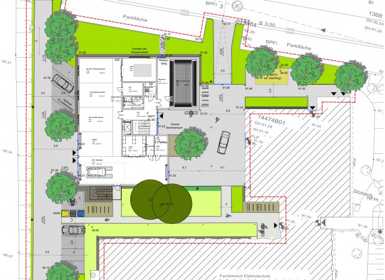 Der Hauptzugang erfolgt im Osten aus der Richtung des Gebäude L. Der Neubau bildet durch das zweigeschossige Hauptgebäude und die eingeschossige EMV-Absorberkammer im Zusammenspiel mit Gebäude L einen angenehm proportionierten Vorplatz zum Hauptzugang.