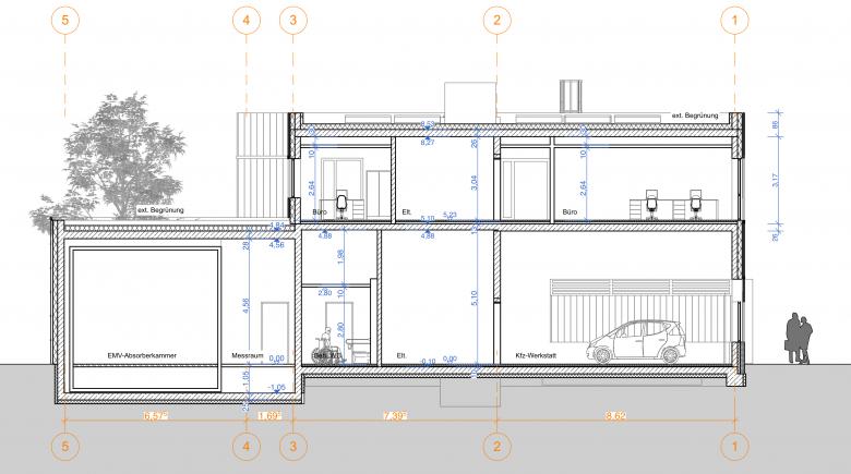 Bei dem neu zu errichtenden Gebäude handelt es sich um eine Forschungsstätte für zukünftige Mobilitätskonzepte sowie ein separat zu nutzendes physikalisches Großlabor für elektromagnetische Verträglichkeit (EMV-Absorberkammer).