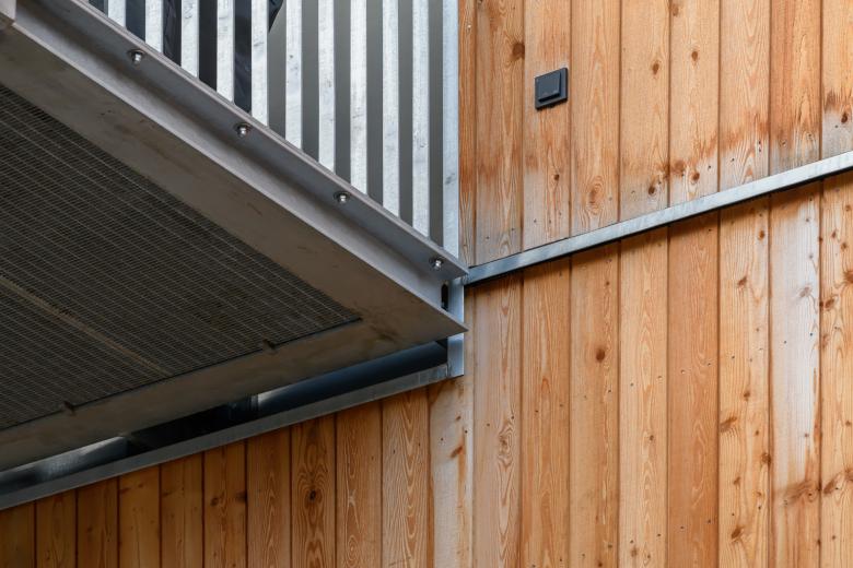 Für die trittschalldämmende Entkopplung entwarfen die Planer eine dreiteilige Stahlbau-Sandwichkonstruktion bestehend aus Stahlteilen (Knagge) und dazwischen gelegten Elastomerlagern. Die Anschlussplatte liegt dabei auf der Holzdecke auf. Das tragende Wärmedämmelement Isokorb verbindet die Balkonkonstruktion und ein liegendes Stahl U-Profil, das mit Elastomerlagern vertikal und horizontal elastisch zwischen den Lagerplatten eingebettet ist. Damit wird die direkte Verbindung Stahl auf Stahl beziehungsweise Stahl an Holz vermieden und die Anforderungen an den Schallschutz können eingehalten werden.