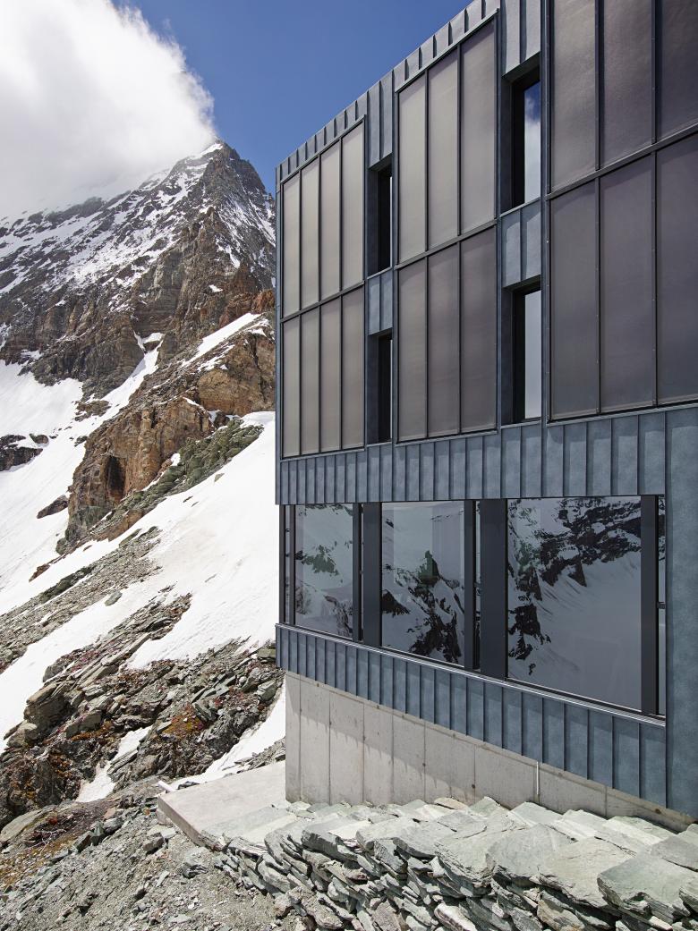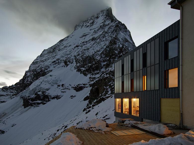 Die neue Hörnlihütte ist ein Zusammenspiel aus Vergangenheit und moderner Technik. Der neu errichtete Teil der Hütte steht exemplarisch für eine wegweisende Hüttenarchitektur. Entlang der weitläufigen Terrasse im Erdgeschoss des Hotel Belvédère befinden sich der Empfangsbereich und die Küche, in den Obergeschossen sind die Gästezimmer und die Nasszellen untergebracht. Der viergeschossige Holzanbau wurde mit einer Prefa-Aluminium-Fassade verkleidet. Er beherbergt die Haustechnik im aus Beton gefertigten Untergeschoss, den Speisesaal mit 130 Sitzplätzen und 180-Grad-Panorama im Erdgeschoss sowie die Schlafräume in den beiden oberen Stockwerken. Im offen gestalteten Erdgeschoss des Anbaus zeigt sich die Konstruktion aus unbehandelter Fichte. Auch wenn das Material Wärme ausstrahlt und damit ein Wohlfühlambiente schafft, war die Wahl eher pragmatischer Natur: Die Robustheit, Einfachheit und Leichtigkeit des Holzbaus trug der Tatsache Rechnung, dass das gesamte Material Stück für Stück mit dem Hubschrauber hochgeflogen werden musste. So rastern kräftige Fichtenstützen die Außenwände des Speisesaals, Unterzüge und aussteifende Wandelemente gliedern ihn.