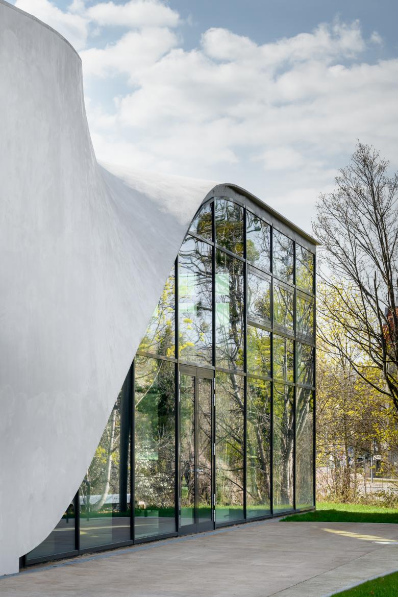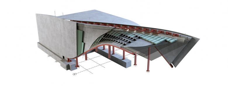 Beim Bau zeigten sich die Qualitäten von Combar, das gestalterisch neue Dimensionen eröffnet: Die doppelt geschwungene, gegenläufige Schale in Sichtbeton dreht sich als Dach-Wandkonstruktion von der Horizontale in die Vertikale. Als Schalungsform für die fugenlose Konstruktion diente eine speziell angefertigte Holzunterlage, auf die die Betonschichten unter Einarbeitung von Carbonfaser-Bewehrungsgittern im Spritzbetonverfahren aufgebracht wurden.