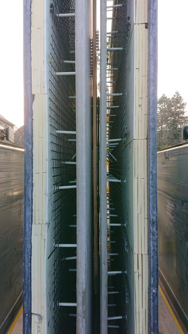 Die Trag- und Wetterschale wurden mit Schöck Isolink verbunden. Nachdem die Glasfaserstäbe in die entsprechend der Traganforderungen vorgebohrten Löcher eingeklebt wurden, konnte anschließend die 14 Zentimeter dicken Wärmedämmelemente aufgesteckt und vollflächig verklebt werden. Die überstehenden Enden des Schöck Isolink sorgen für den zuverlässigen Halt der 4 Zentimeter starken Wetterschale aus Carbonbeton. Die Gesamtstärke dieser innovativen Decken-Wandkonstruktion beträgt 27 Zentimeter.