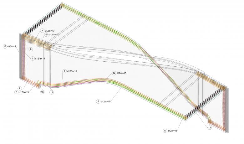 Beide TWIST-Schalen liegen auf einer Stahlkonstruktion und setzen am Boden auf ein Fundament auf. Als Anschlussbewehrung wurde der Glasfaserverbundwerkstoff Combar eingearbeitet und bei der Fertigung der Tragschale im Spritzbetonverfahren einbetoniert.