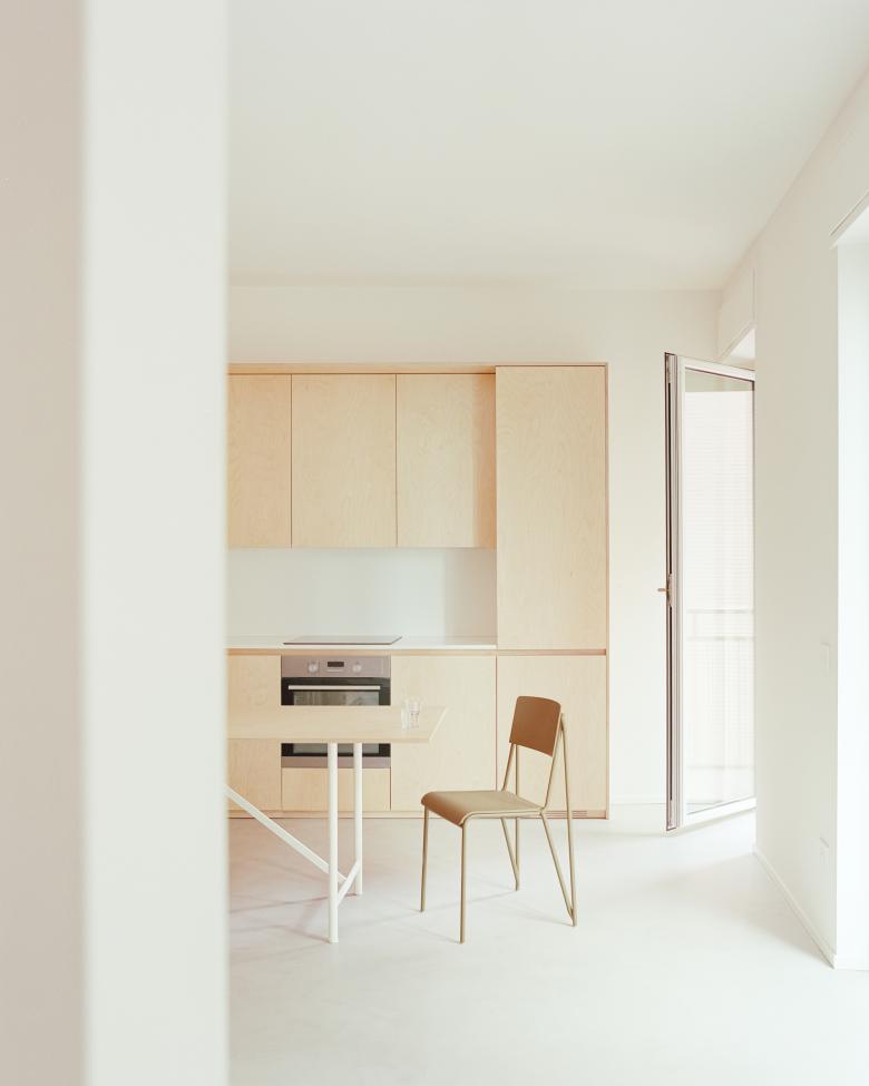 SET Architects completes a home office for a young client in a small flat in the center of Milan. In a historical moment where every type of cataloguing is overcome by breaking down rigid preconceptions, even living spaces become hybrid and flexible, opening up to new uses and functions. Especially, in the last period, we have been witnessing a sudden transformation of the methods of carrying out work in the office, which is becoming increasingly dynamic and detached from the physical headquarters of the company. In fact, more and more people have the opportunity to work from anywhere, and many prefer the comfort of the home environment to the office. The renovation project was born from the need of a young client to transform a traditional 70 sqm flat in the centre of Milan into a space for living and working, with the aim of defining separate areas and at the same time visual continuity between them. The idea was to exploit an apparent constraint of the pre-existing building, in a design opportunity. A residual corner, generated by the presence of the lift shaft, has acquired the new function of an office corner, with cosy and intimate proportions, characterized by excellent natural lighting and direct connection with the heart of the house. The masonry works were reduced to a minimum, limiting the demolition of a wall to connect two rooms in a single room which became the living/dining area. The choice of materials was made on the basis of neutral and warm colours in order to obtain a relaxing and welcoming environment, suitable to be lived in at different times of the day both as a workspace and as a home. Specifically, a light grey microcement was used for the floor, the walls are in a warm white and the bespoke furnishings are in birch plywood, chosen for its characteristic light grain in soft tones. All the furnishings have been designed and realized for the flat in order to obtain a custom space according to the owner’s needs: A flexible home in which to live and work in harmony with the architectural space.