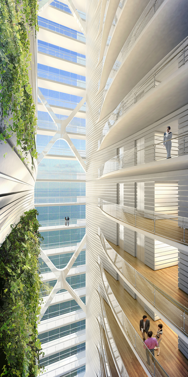 Like sculpting a high-performance automobile, digital aerodynamic modeling was critical to shaping this 1,175-foot super-tall tower. Acting as the “lung” of the building, the tower’s atrium is defined by a 30-story-tall operable window, which invites cool air flow during summer months and floods the interior spaces with natural light. The atrium has also been designed to facilitate mixed mode ventilation in the lobbies and public spaces, providing a fresh air supply source for the building and its inhabitants. A series of high-efficiency measures employed on the tower are predicted to achieve a 60% savings in energy consumption as compared to a conventional American high-rise.