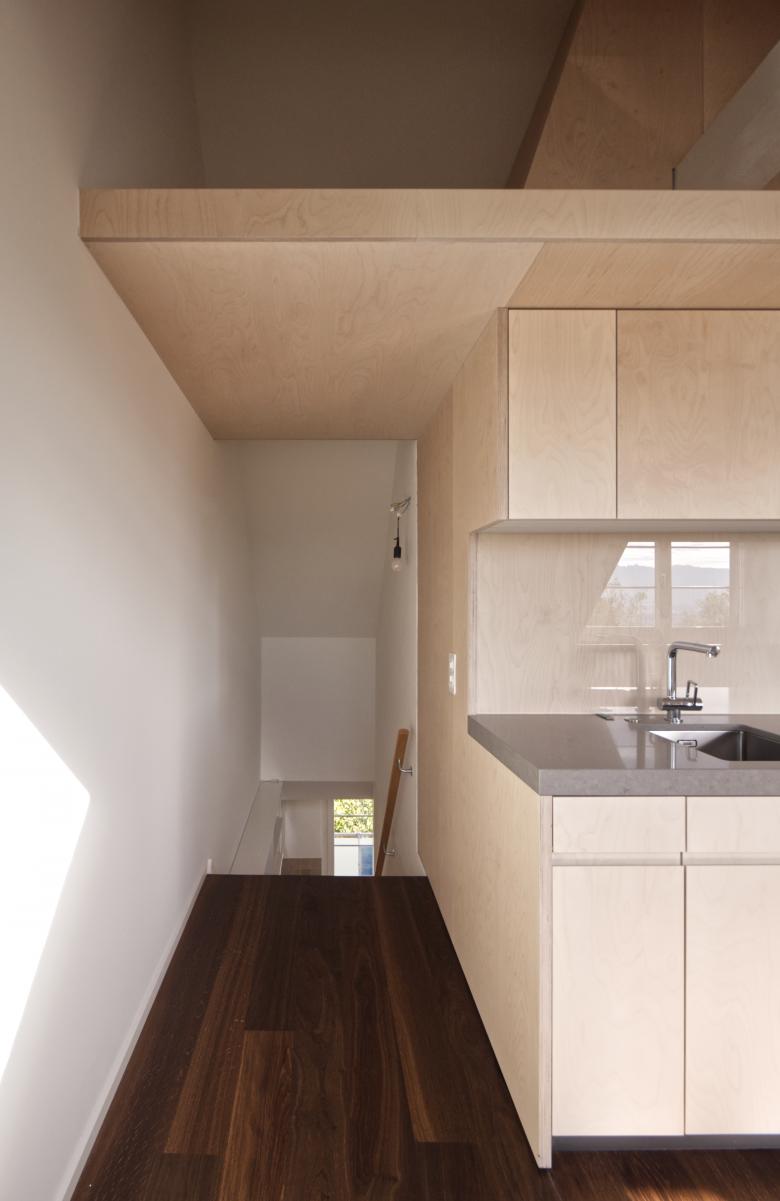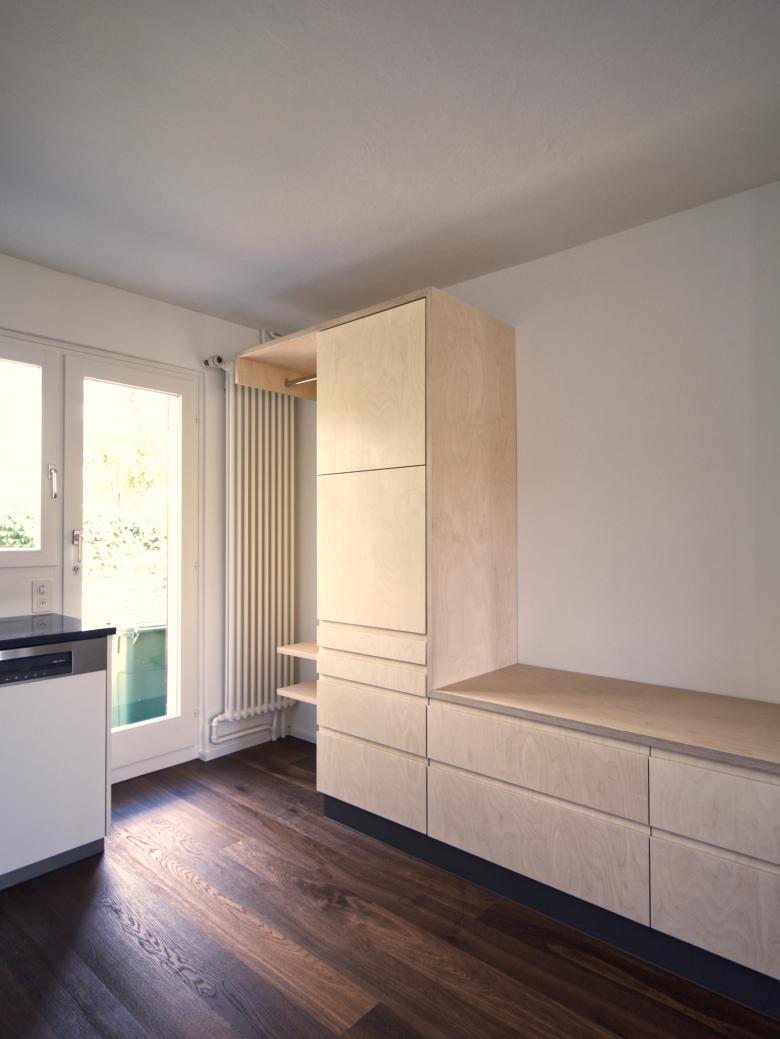 Begleitend zur Aufwertung des Dachgeschosses wurde im Erdgeschoss die Trennwand zwischen Küche und Wohnen geöffnet. Die Küche wurde durch ein Sideboard mit angegliederter Garderobe ergänzt, ebenfalls in Birkensperrholz materialisiert. Der Boden wurde mit dem gleichen Parkett aus geräucherter Eiche belegt wie der Dachraum.