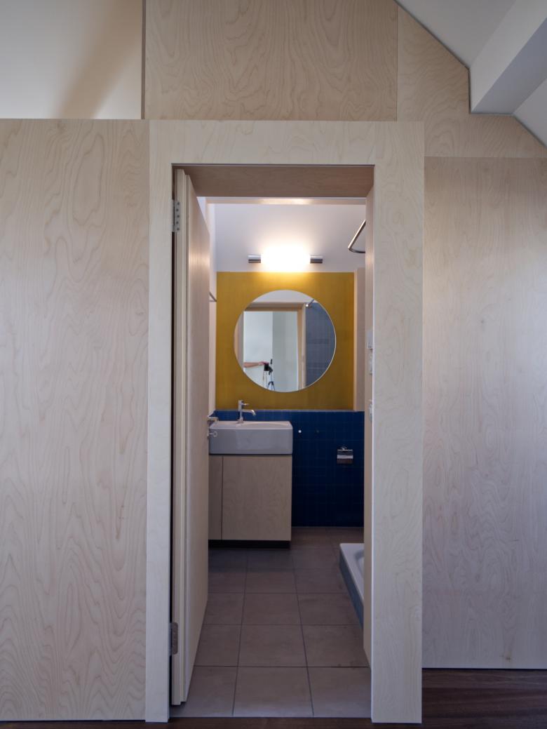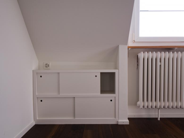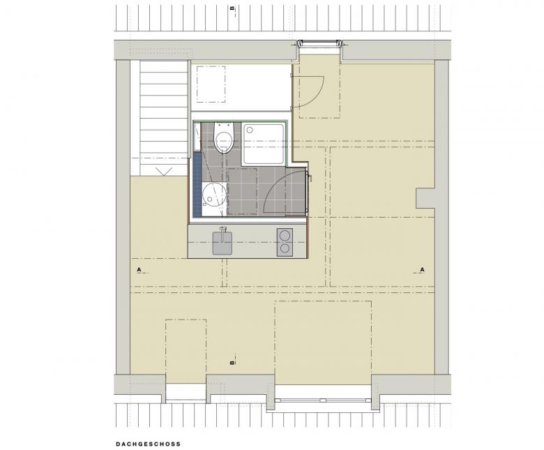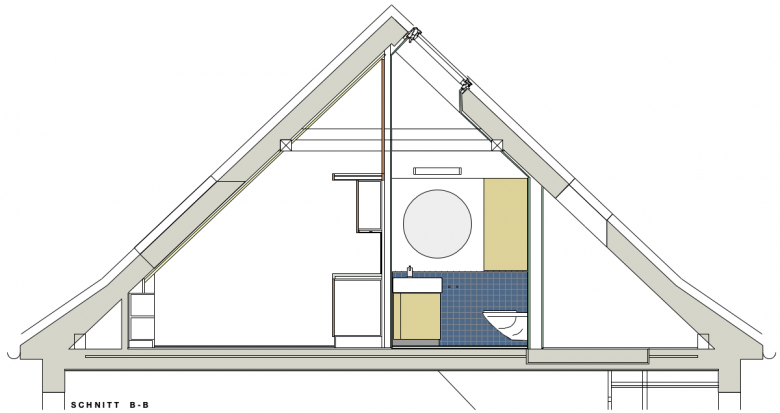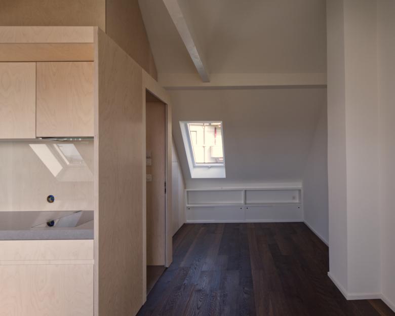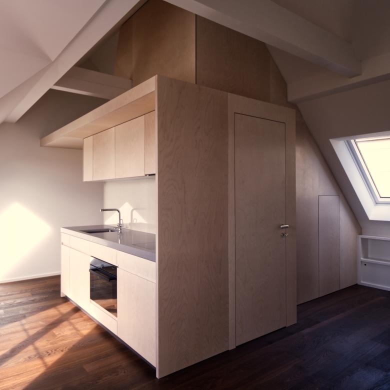 Ein Reiheneinfamilienhaus in der gleichen Siedlung wie der Badezimmereinbau. Der bereits mit einer Lukarne versehene, aber bisher erst teilweise zum Wohnen genutzte Dachraum sollte zu einem eigenständigen Studio mit Bad und kleiner Küche ausgebaut werden. Die kleine Grundfläche von ca. 5.5 m x 6.5 erforderte einen entsprechend ökonomischen Umgang mit dem zur Verfügung stehenden Raum.