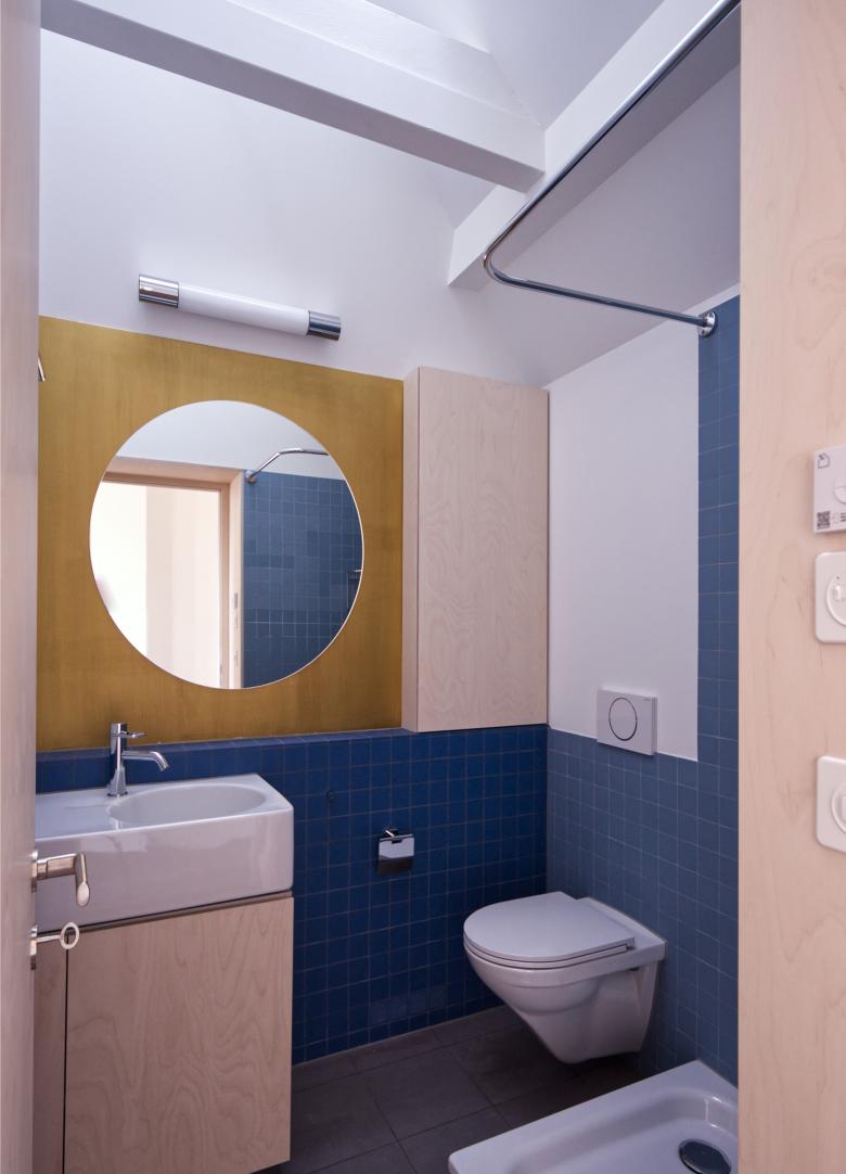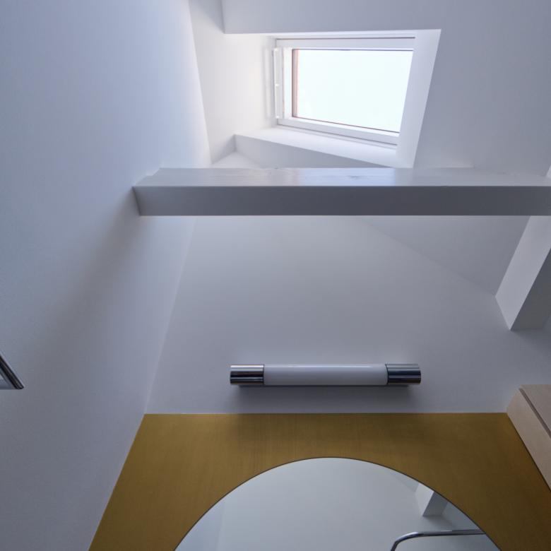 Eine Überraschung eröffnet sich beim Eintreten in das neue Bad. Der Raum reicht bis in den First, wo ein Dachflächenfenster für viel Tageslicht und die Möglichkeit einer natürlichen Lüftung sorgt. Die mit Goldbronze beschichtete Wand hinter dem Spiegel bringt die unterschiedlichen Lichtstimmungen verstärkt zum Ausdruck.