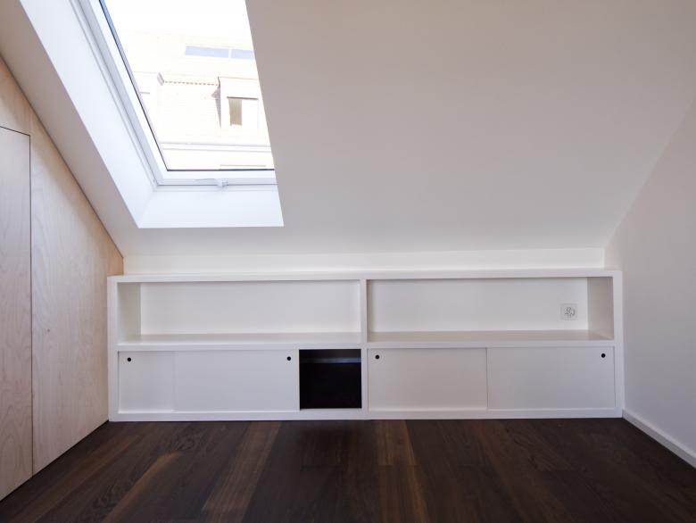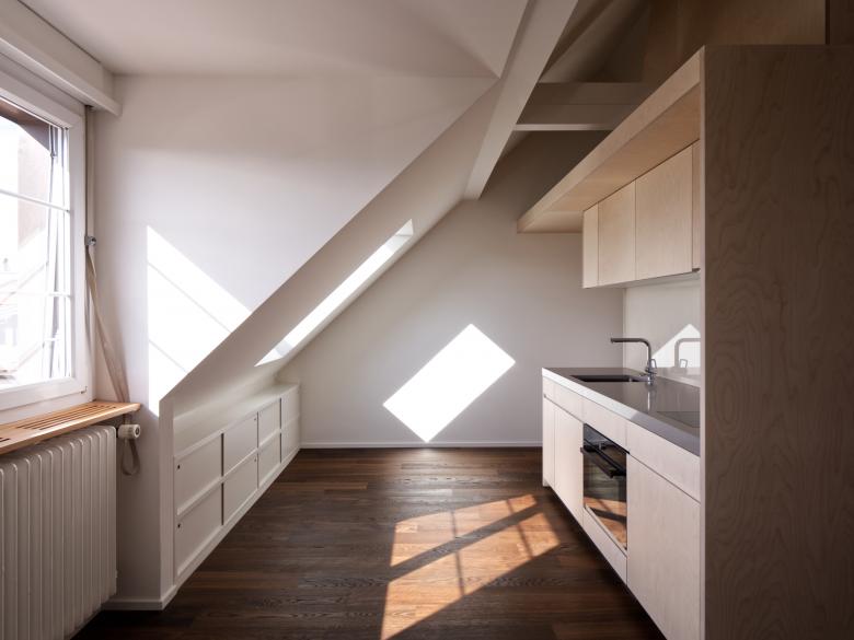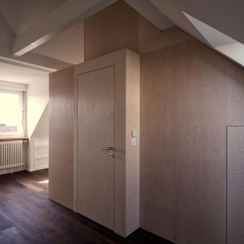 Die Materialisierung des neuen Volumens in finnischem Birkensperrholz kontrastiert mit dem dunklen Parkett. Alle übrigen Oberflächen im Dachraum sind zurückhaltend weiss gestrichen, so auch die fest eingebauten Regale im Kniestock.