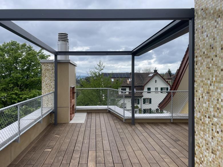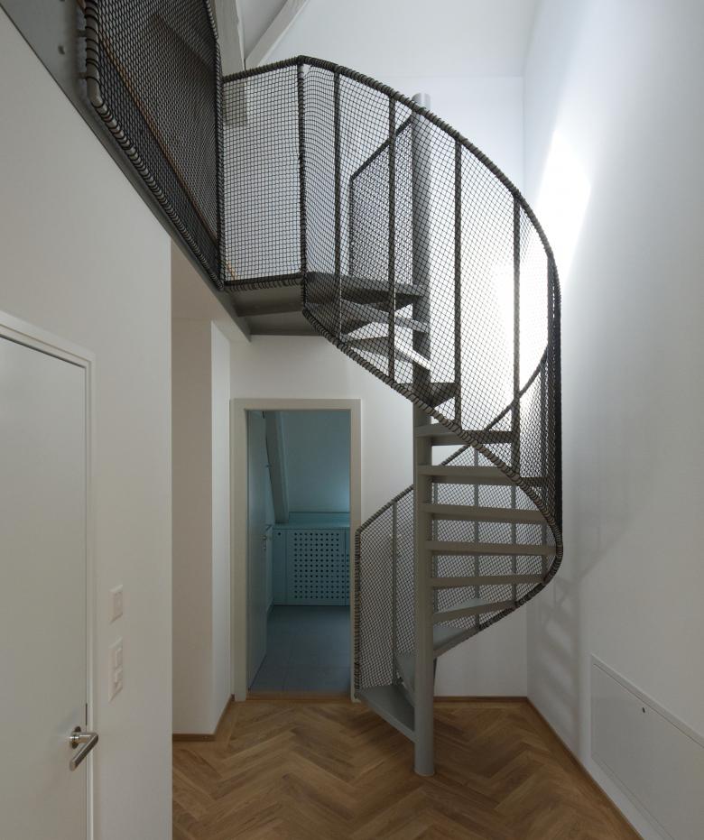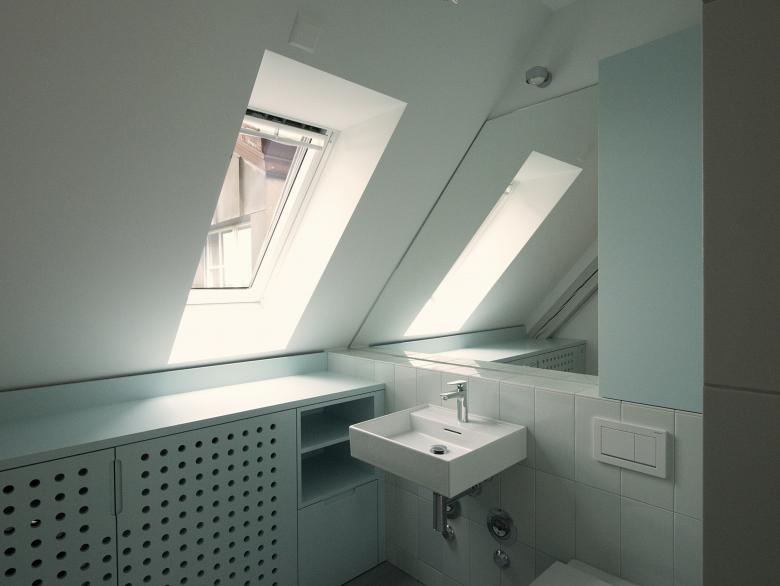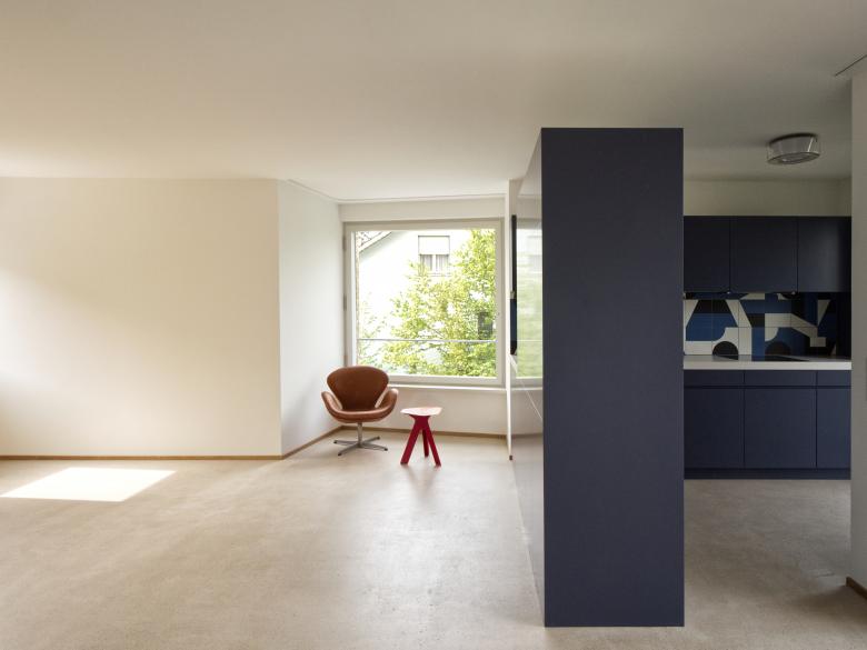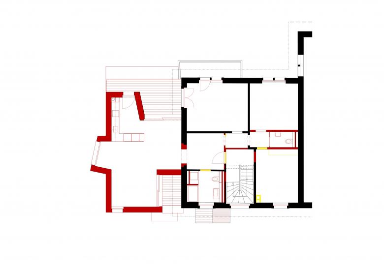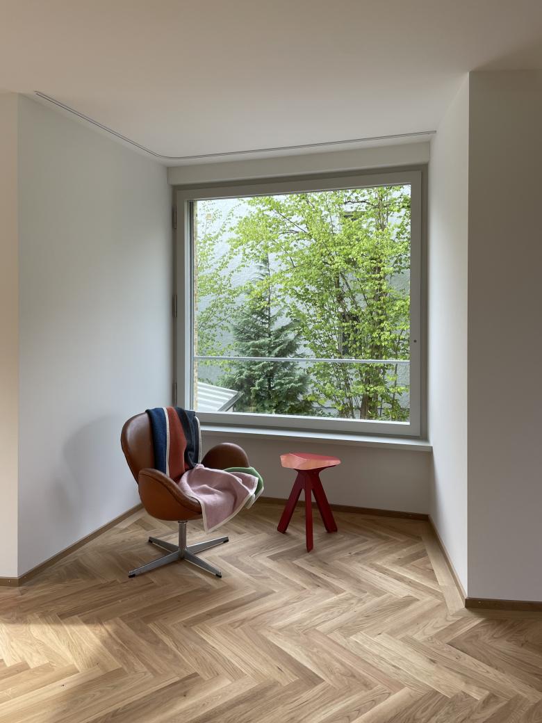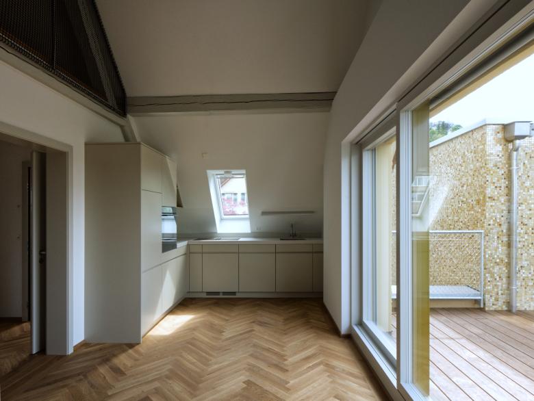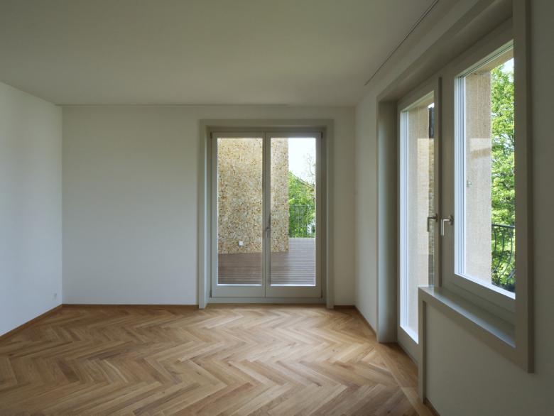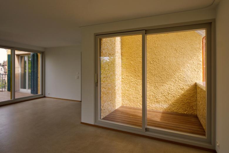 Der Anbauteil erhielt eine Aufstockung in gewichtssparender, vorfabrizierter Holzbauweise. Das neue Volumen schliesst im OG mit zwei markanten Einschnürungen so an die Giebelfassade des Bestandes an, dass das weit vorstehende Steildach des Altbaus nicht tangiert wird. Die dadurch geschaffenen eingezogenen Terrassen prägen den Grundriss im OG und die Dachterrasse der Wohnung darüber.