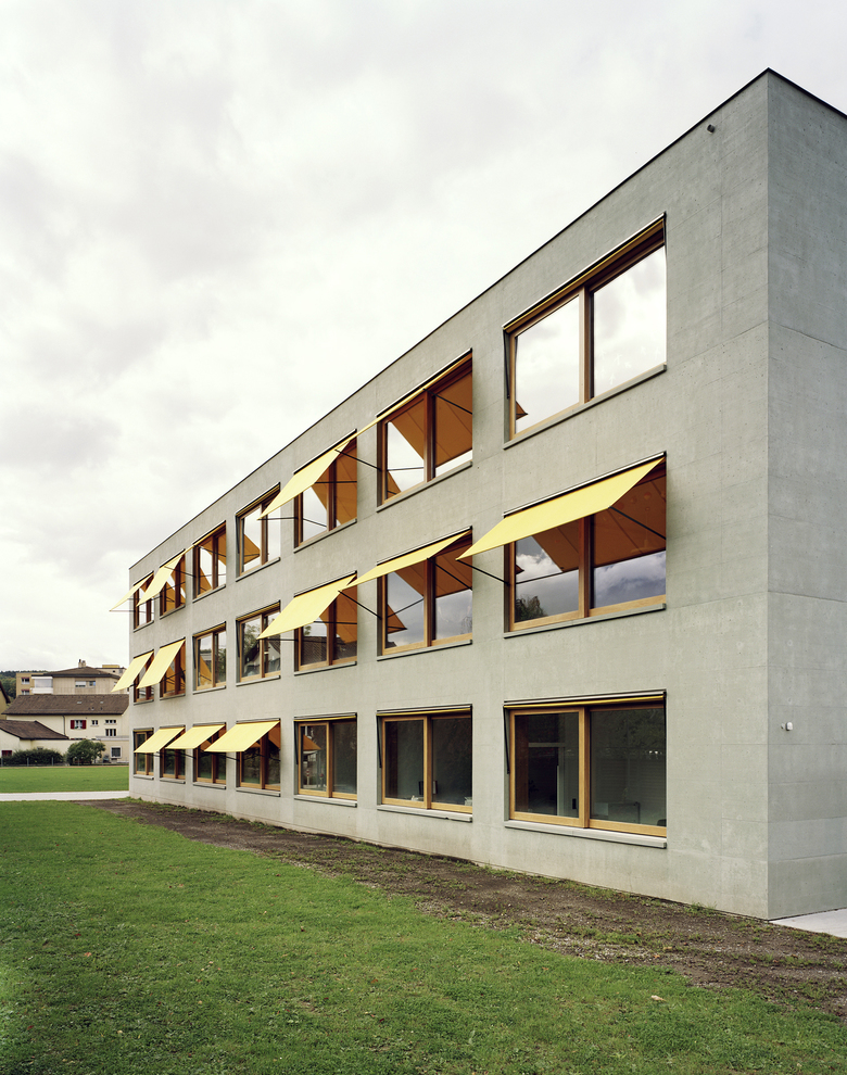 Die Fassaden sind vom immer gleichen, grossformatigen Schiebefenster bestimmt. Die Fassadenfront im Erdgeschoss kann im Sommer auf der ganzen Länge geöffnet werden, so dass die Pausenhalle im Erdgeschoss und der Schulhausplatz nahtlos ineinander verschmelzen.