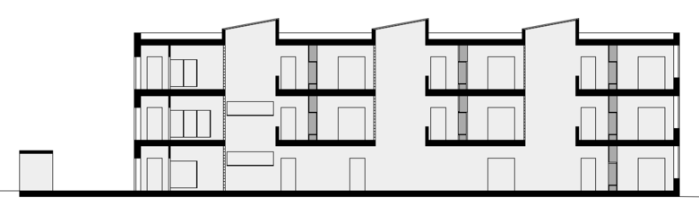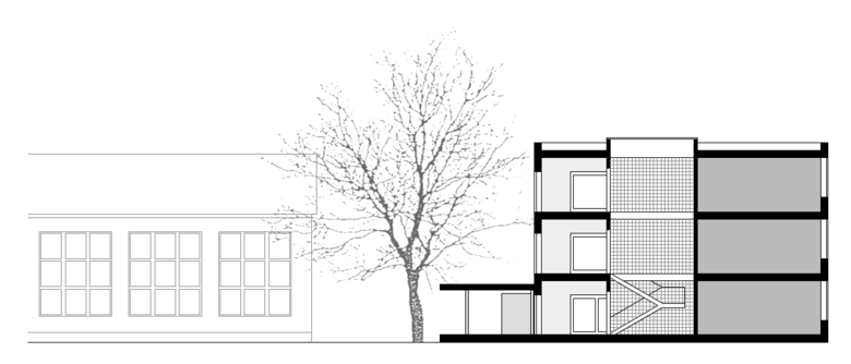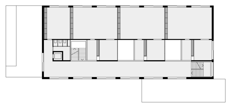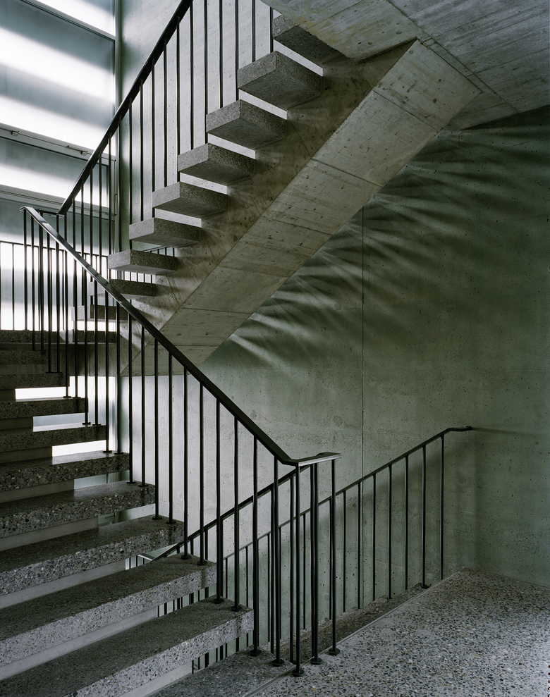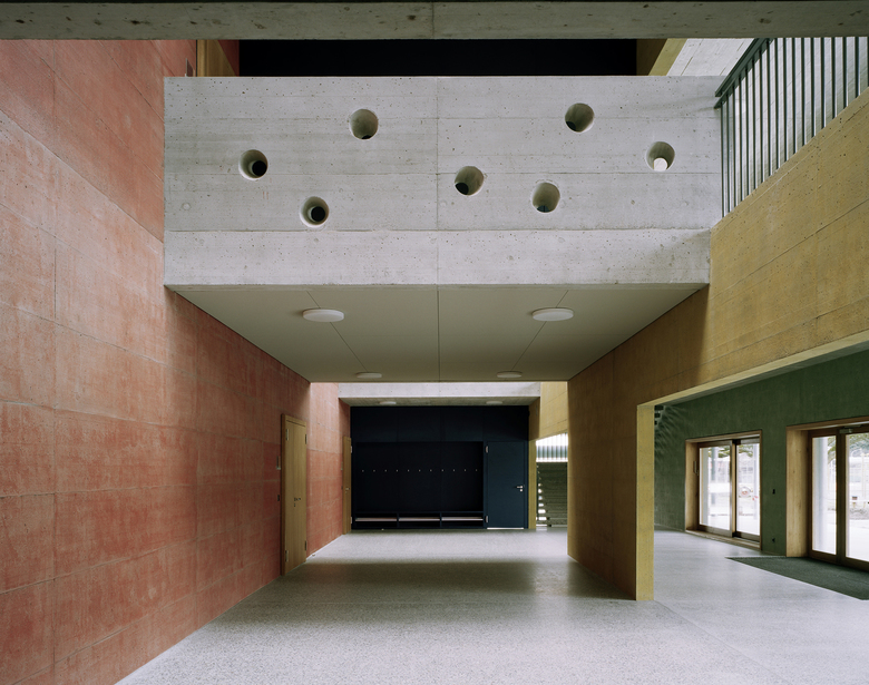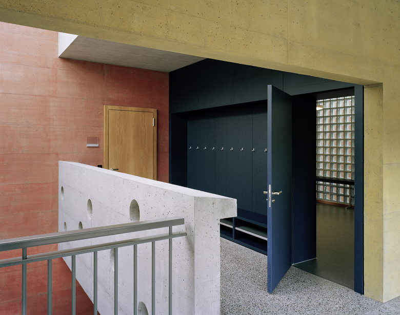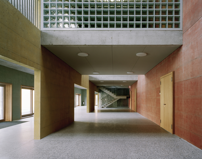 Der Baukörper ist in drei parallele Raumschichten gegliedert. Im Zentrum des Grundrisses sind zwischen Klassenzimmern und Korridor die Gruppenräume eingespannt, über drei Lichthöfe mit Tageslicht versehen. Sie sind sowohl vom Klassenzimmer als auch vom Korridor aus zugänglich und gewähren so maximale Nutzungsflexibilität.