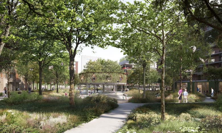Der Quartierplatz stellt als öffentlicher Freiraum in der Arealentwicklung Volta Nord einen zentrumsbildenen Baustein dar. Er definiert sich als stadträumliches Bindeglied der Strassenräume, deren atmosphärische Qualitäten aus dem St. Johann-Quartier abgeleitet sind. Angelehnt an den Grundmustern des Quartierplatzes mit seiner klar begrenzten Aussenkante, steht er exemplarisch für einen Freiraum zukunftsweisender, nachhaltiger Entwicklungen. Den starken Rahmen des Platzes bildet ein vegetativer Saum, welcher im Biotopverbund mit der umliegenden Strassenbegrünung gedacht, ökologische und klimatologische Funktionen erfüllt. Meteorwasser wird im Sinne der Schwammstadt vor Ort gesammelt, versickert und in den Kreislauf zurückgeführt. Das Innenleben des Platzes definiert sich als Treffpunkt des Quartiers und gliedert sich in zwei typologisch unterschiedliche Bereiche. Eine multifunktional nutzbare Platzfläche mit Spielplatz im Norden sowie ein vielfältig nutzbarer Pavillon im Süden.
