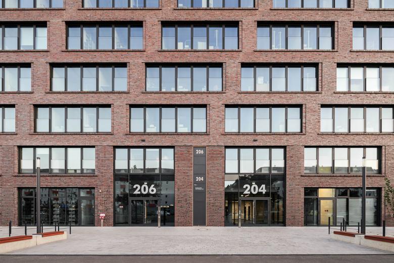 Auf dem rund 6.000 m2 großen Eckgrundstück zwischen Frankfurter Allee und Buchberger Straße im Berliner Bezirk Lichtenberg entstand ein modernes, trapezförmiges Bürogebäude mit begrüntem Innenhof und einer expressiven rostroten Klinkerfassade, die sich in Materialität und Farbigkeit an den historischen, Anfang des 20. Jahrhunderts entstandenen industriellen Bestandsgebäuden orientiert und einen neuen kontrastreichen Akzent zur sonst postmodernen Umgebungsarchitektur aus der DDR-Zeit setzt.