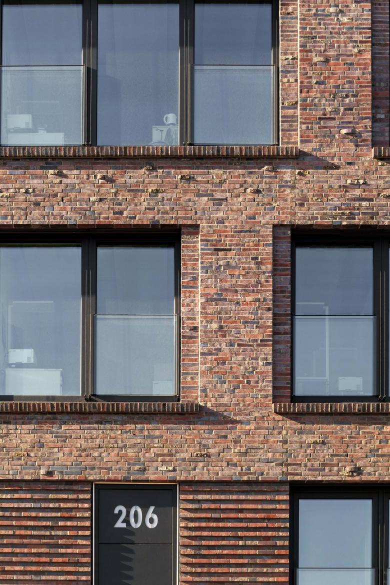 Die Fassade besticht durch ihre haptische Qualität und ihre besonderen Details. Durch den Wechsel der Fensteranordnung und Struktur der Klinker wird die Fassade optisch in zwei Bereiche geteilt. Der Sockelbereich umfasst das Erd- und erste Obergeschoss. Das lineare, horizontale Klinkerrelief erinnert an Gebäude des Expressionismus. Die Fensterelemente liegen übereinander, die Gebäudeecken sind geschlossen. Die Eingangsbereiche erscheinen zweigeschossig. Großformatige Hausnummern sorgen für eine klare, weithin sichtbare Adressbildung. Bei den darüber liegenden Geschossen ist die Klinkerstruktur vornehmlich glatt. Einzelne Klinker mit durch Kohlebrand konvex strukturierter Oberfläche und im unregelmäßigen Mustern gesetzt heben sich von der glatten Oberfläche ab und sorgen für spannende Akzente, insbesondere bei unterschiedlichen Sonnenständen und Lichtstimmungen. Durch die geschossweise Verschiebung der einzelnen, bodentiefen Fensterelemente um ein Rasterfeld entsteht eine ganz eigene Fassadendynamik. Die Gebäudeecken sind im Rhythmus des Rasters verglast.