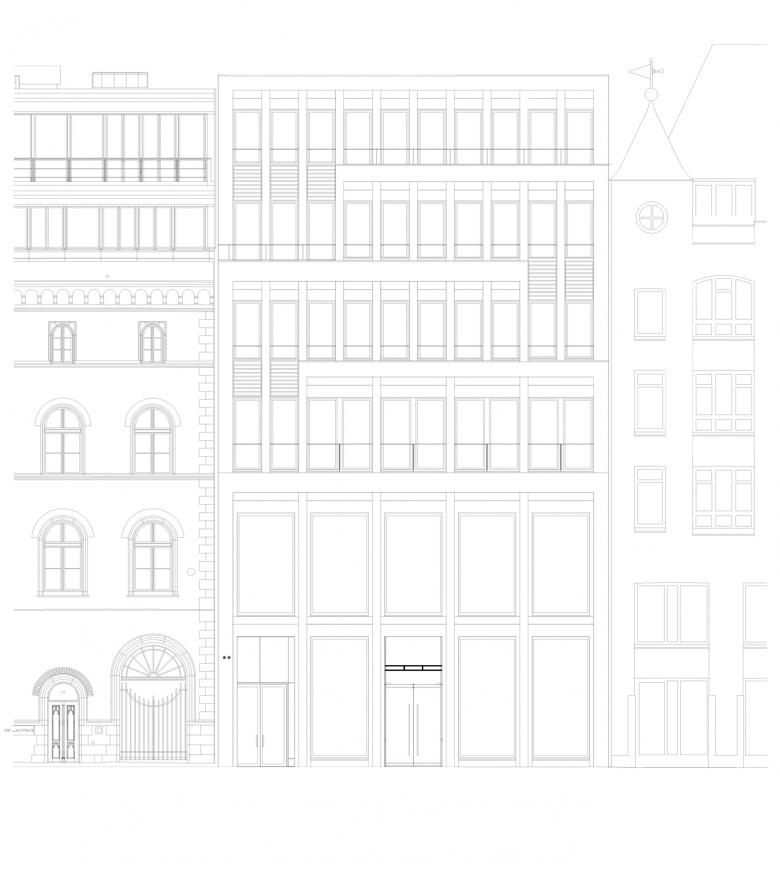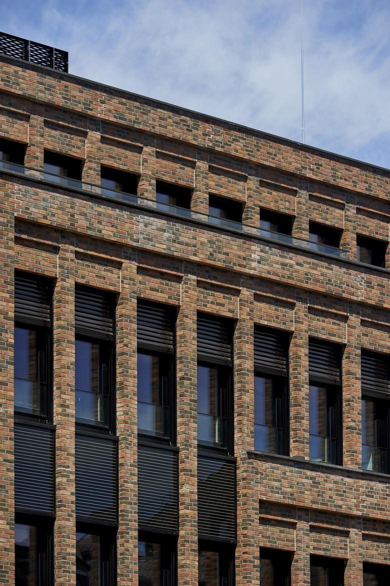 Die reiche Architektursprache der Umgebung mit ihren traditionellen Backsteinbauten findet sich in den Fassaden des Neubaus wieder. Raumhohe Fenster mit dezenten Rahmen aus eloxiertem Aluminium strukturieren die Oberflächen. In den Obergeschossen werden zusätzlich dezente Glasbrüstungen als Elemente französischer Fenster eingeführt.