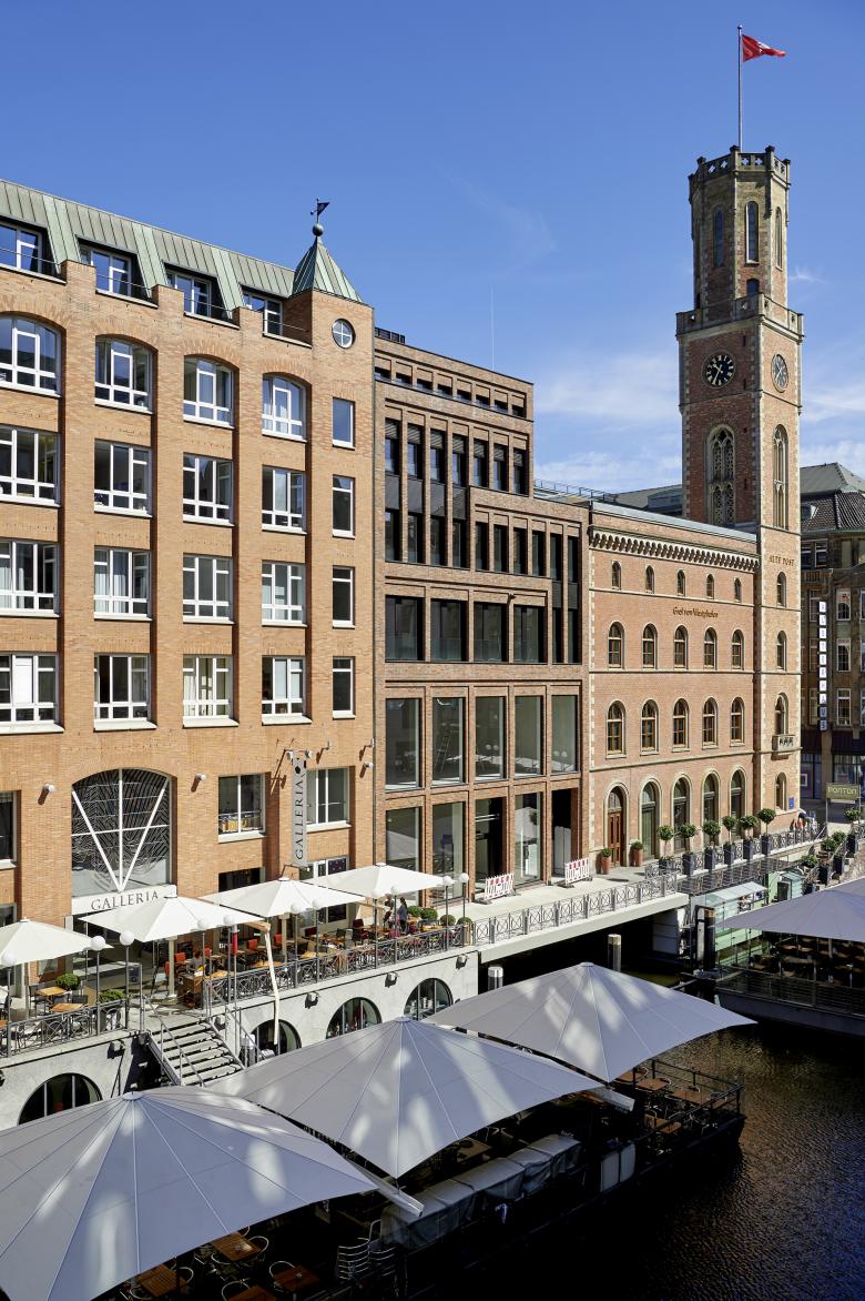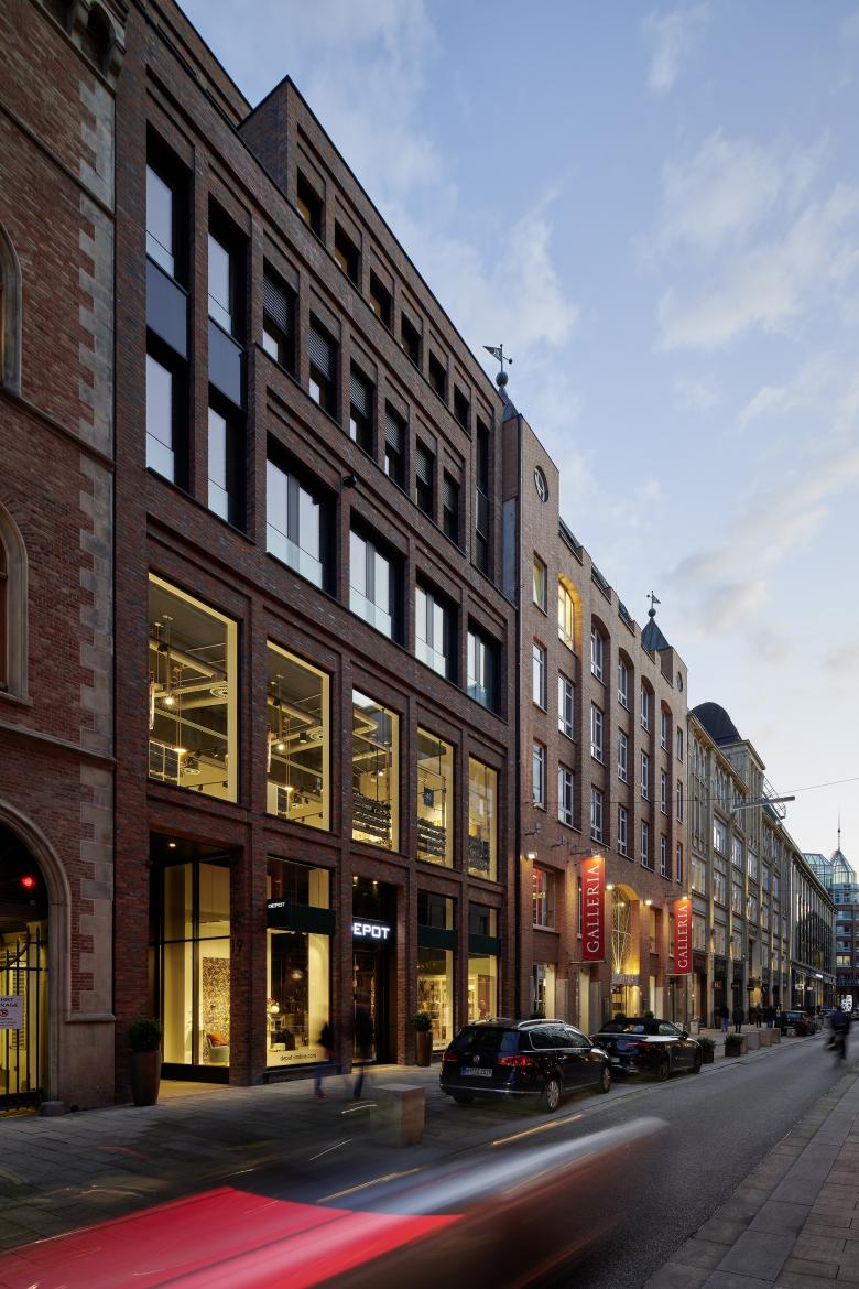 Das Gebäude vermittelt geschickt zwischen seinen Nachbarn Alte Post und Galleria Hamburg, die seit kurzem ebenfalls unter Denkmalschutz steht: Die unterschiedlichen Traufhöhen werden weitergeführt und durch abgewinkelte Abschnitte in der Fassade vereint. Das Straßenbild bleibt stimmig, während der eigenständige Gebäudecharakter durch Staffelungen hervorgehoben wird.
