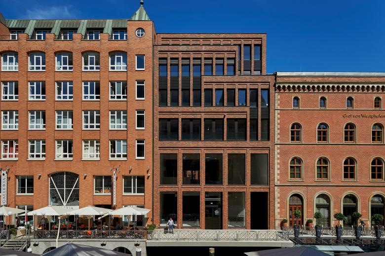 Direkt am denkmalgeschützten Gebäude der Alten Post, am belebten Bleichenfleet in der Hamburger Innenstadt entstand das neue Geschäftshaus mit Einzelhandelsnutzung. Der sechsgeschossige Neubau füllt eine 80 Meter tiefe und nur 14 Meter breite Baulücke und fügt sich nahtlos in die Umgebung ein.