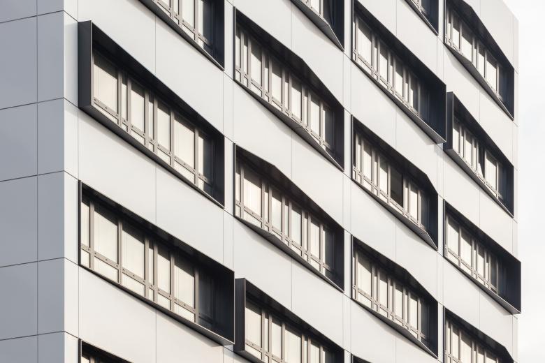Die neue, hinterlüftete, vorgehängte Fassade besteht aus großformatigen, hochwetterfest pulverbeschichteten, weißen Aluminiumblechkassetten. Gegliedert werden diese durch weit auskragende, aus Aluminium-Strangpressprofilen individuell gefertigte Leibungskästen der Fenster. Die neuen, thermisch getrennten und hochwärmedämmenden Aluminium-Drehkippfenster bzw. Festelemente entsprechen optimal den aktuellen Anforderungen an Wärme- und Schallschutz. Die eingeschossige Fassade des Parkhauses zur Wilhelmsaue wurde mit vorgeblendeten Aluminium-Lamellen verkleidet und erhielt eine Farbgebung analog zur Hauptfassade. Auf dem Dach von Bauteil 3 wurde eine ca. 145 m² große Dachterrasse errichtet.