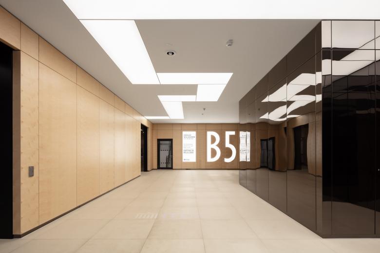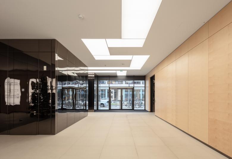 Der Komplex erhielt zudem eine angemessene, repräsentative Eingangssituation. Die Lobby und die Aufzugsvorräume vom 1. bis 8. Obergeschoss wurden mit Wandverkleidungen aus großformatigen, echtholzfurnierten Tafeln und Sockeln aus spiegelpolierten, schwarz titannitritbeschichteten Edelstahl-Blechprofilen versehen.