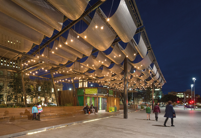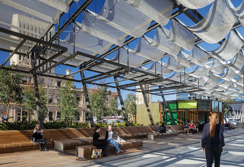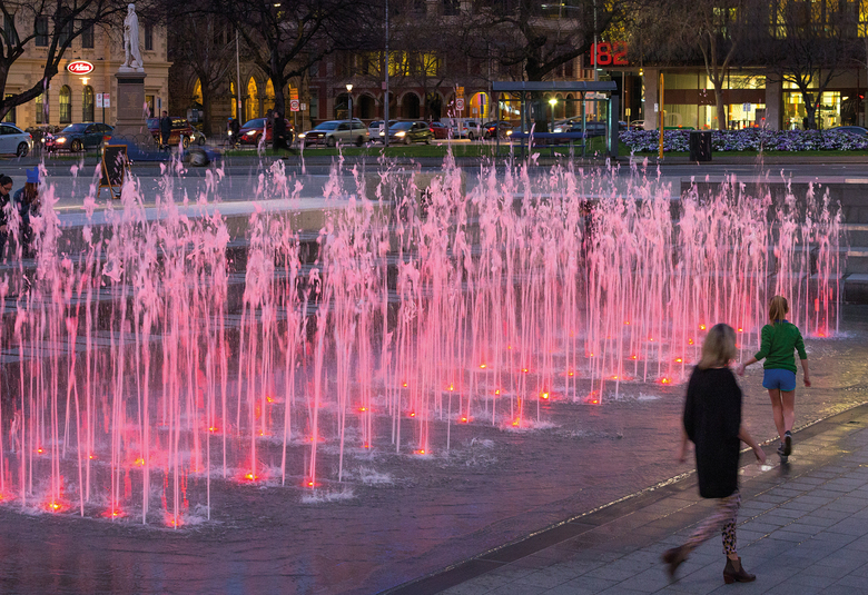 The first stage draws people in the square in both everyday and event mode. It includes a fully serviced events lawn to allow for large events of up to 6,000, promenades, terraces, toilets, temporary shelters (with footings for the future arbours and mechanical fixing for easy relocation), toilets, extensive urban lounges, and a central plaza designed to accommodate cars and function as a pedestrian plaza, depending on need. The Three Rivers Fountain is relocated to the southern end freeing up space for a generous northern plaza and interactive water-feature which also functions as a stage for events. The design accommodates the future implementation of elements such as widening the road, an information centre and large connecting arbours without altering existing designed elements.