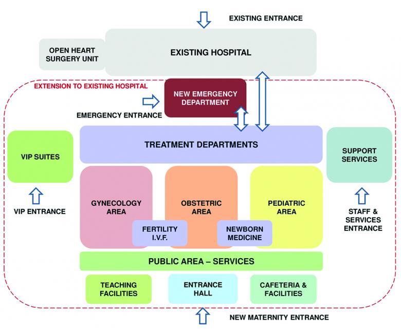 Ministry of Health of UAE decided to expand Al Qassimi Hospital, in addition to 200 beds for maternity, gynecology and pediatrics as self-contained hospital for all kinds of services and facilities. It was also decided to extend the emergency department of the existing hospital to respond to the additional needs for better emergency services. Ministry of Public Works of UAE, that financed the project, appointed UPA Italia by Paolo Lettieri Architects and UPA as consultants for design and site supervision. The design is developed as joint venture between General Planning & UPA Italia by Paolo Lettieri Architects and UPA, Urbanism Planning Architecture. Project MCK did consultancy services for medical planning and equipment. UPA Italia by Paolo Lettieri Architects and UPA continued the project up to site supervision and final delivery to client.