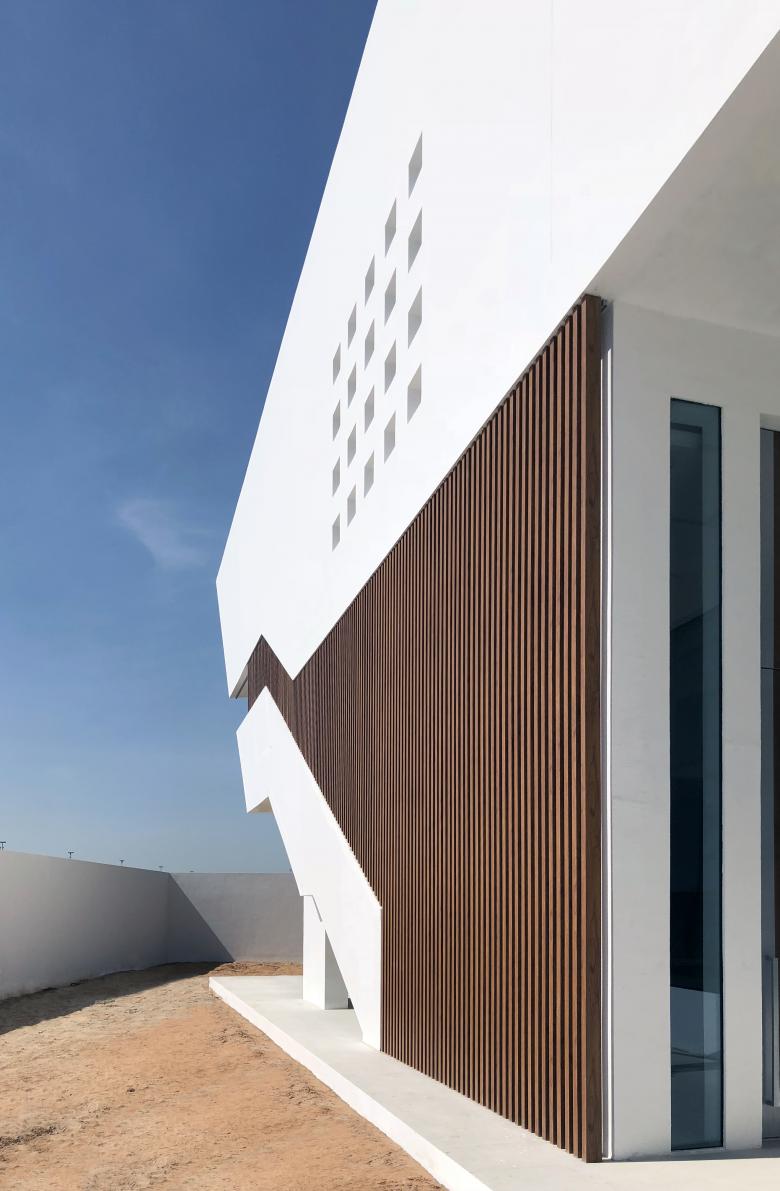The facade of the villa that overlooks the main road has been designed with a semi-solid treatment, to preserve privacy, while the facade facing the sea is characterized by transparent glass and balconies and opens onto the external area which includes a garden and an outdoor swimming pool.