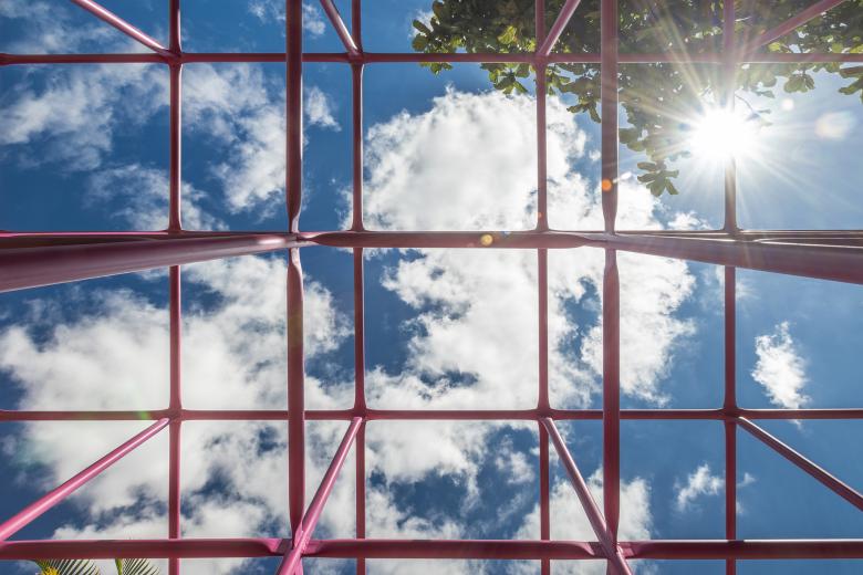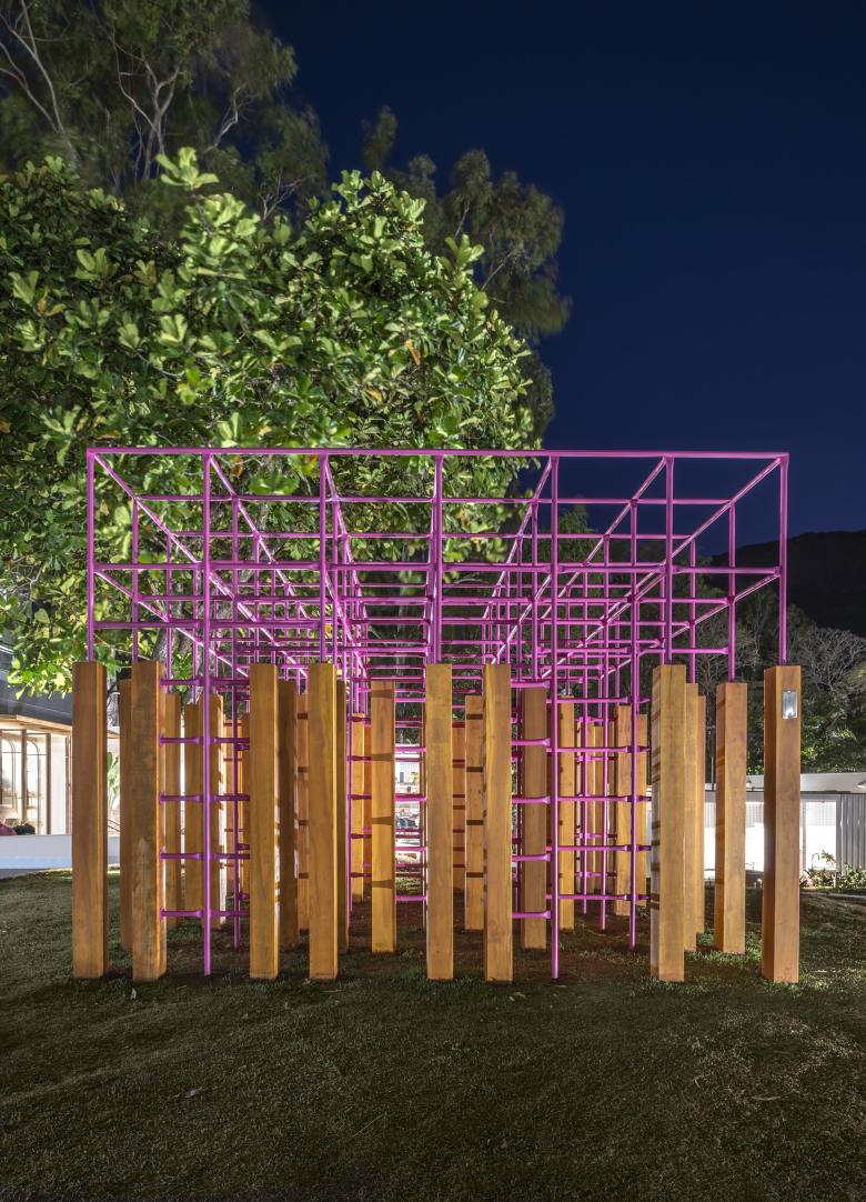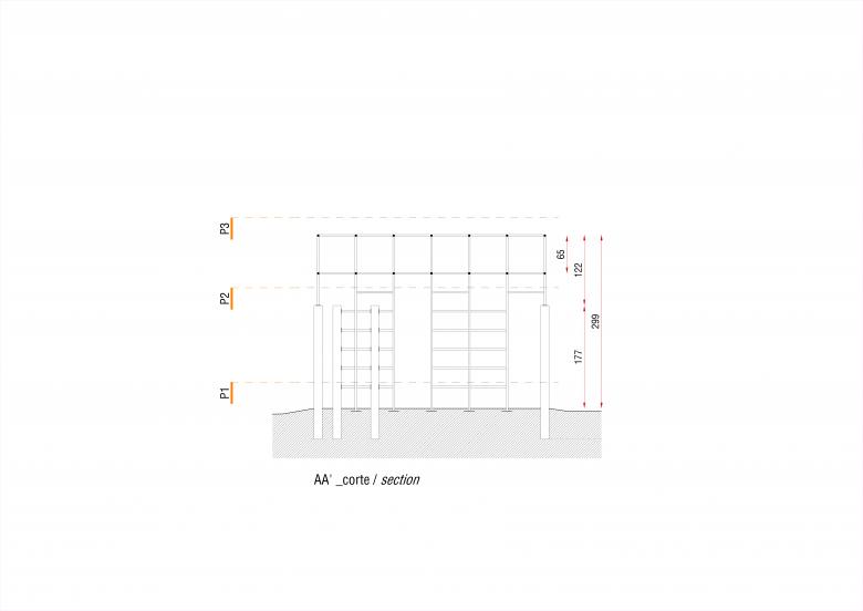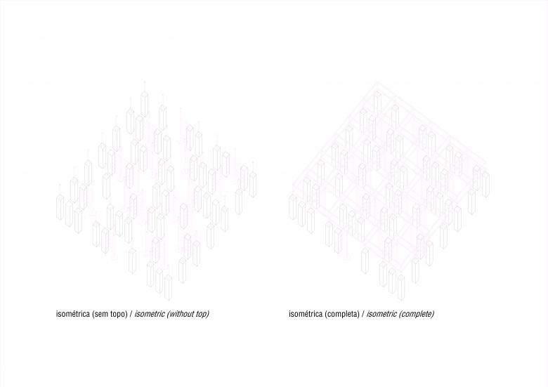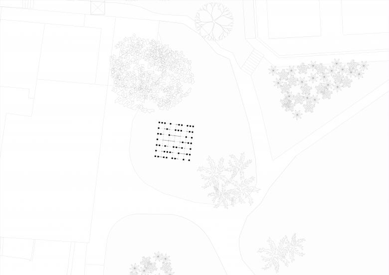 With its many wooden pillars, the project proposes a playful and labyrinthine place. Unhurried visitors can get lost among its pillars; children (and adults!) can climb the metal grate; and whoever observes it from afar sees an object that is sometimes closed, sometimes open, sometimes half-open.